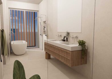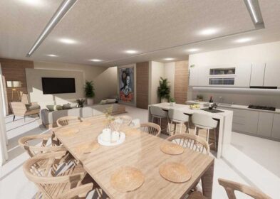 A private 3 x 8-meter pool sits right by the beach. Surrounding spaces include a BBQ terrace, landscaped garden, and a beachside lawn for outdoor relaxation. A covered veranda extends the living area, offering shade and flexible space for dining or work.