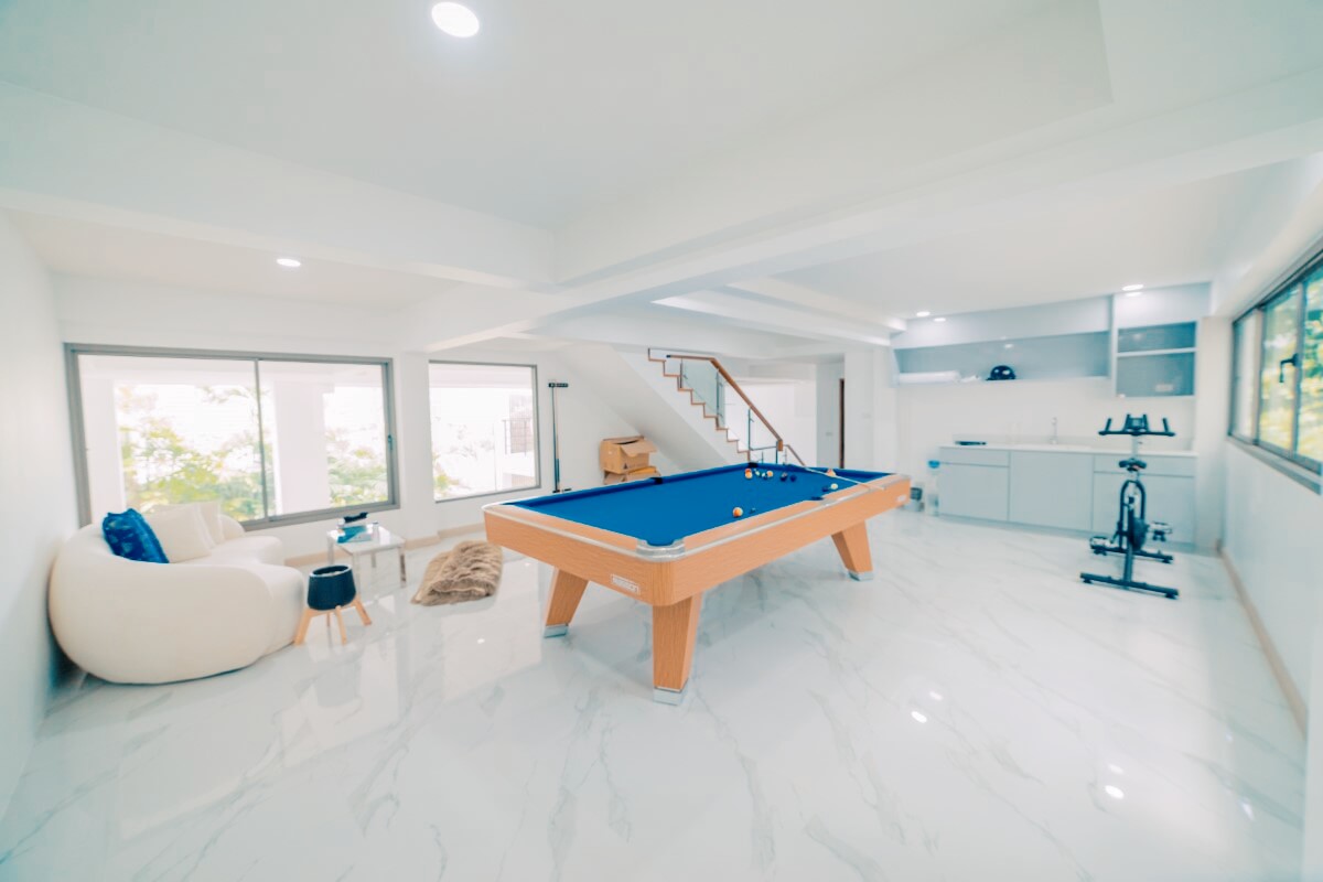 The ground level handles arrival and utility, with an automated entrance gate, covered parking for two SUVs, and a secondary living or lounge area. The second level accommodates the guest bedrooms alongside an additional living area, a maid’s room, laundry room, multi-purpose playroom, and a bedroom that can also serve as a home office. Landscaped garden features are incorporated into this level, along with a balcony and deck.