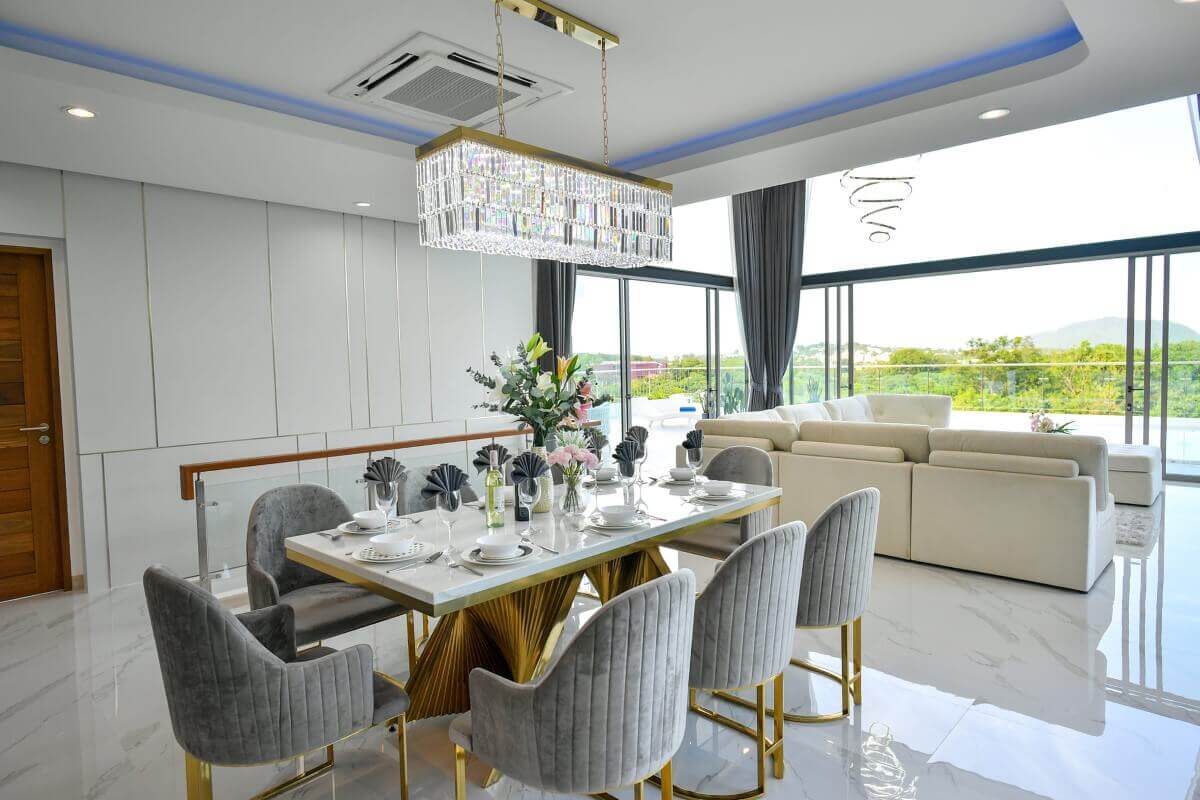 The third level brings together the master bedroom and the main open-plan living, dining, and kitchen area, with direct access to the terrace, swimming pool, and outdoor seating. The villa occupies approximately 620 sqm of the gently sloping plot, with the remaining land extending in front of the property.