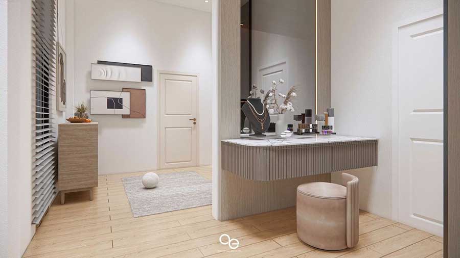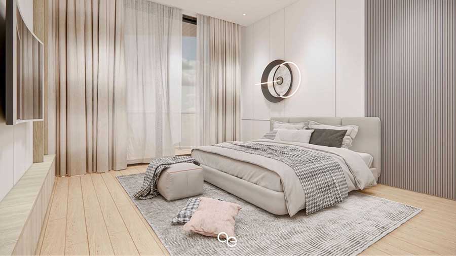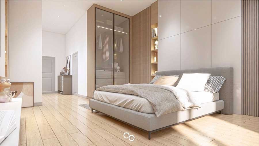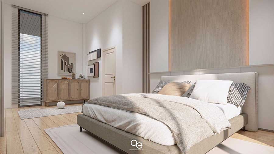 The master bedroom is located on the ground floor and opens directly onto the pool terrace. This bedroom is served by its own bathroom and is positioned to provide privacy from the main living areas.