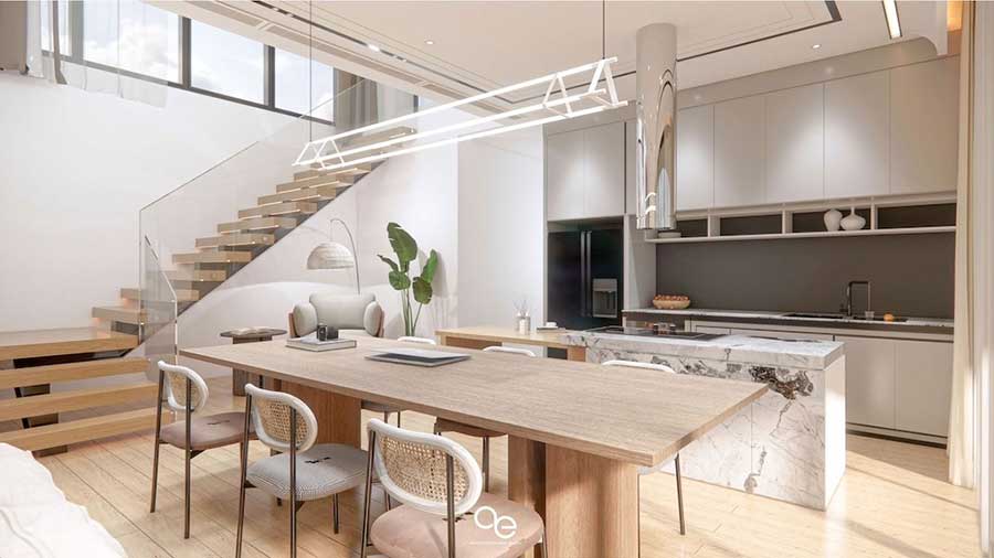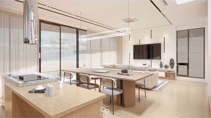The ground floor is designed around a central open-plan layout with direct access to outdoor living areas.