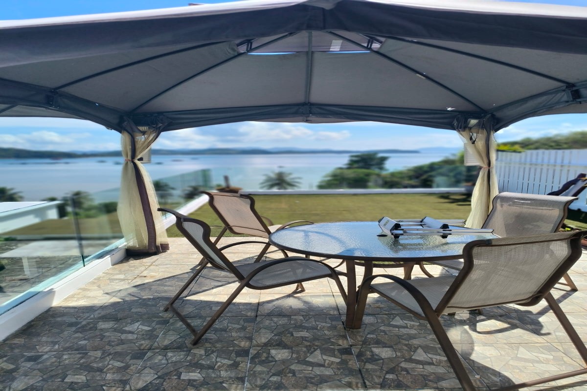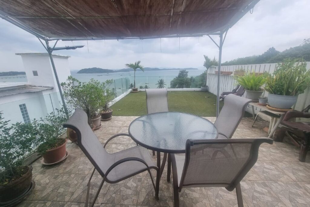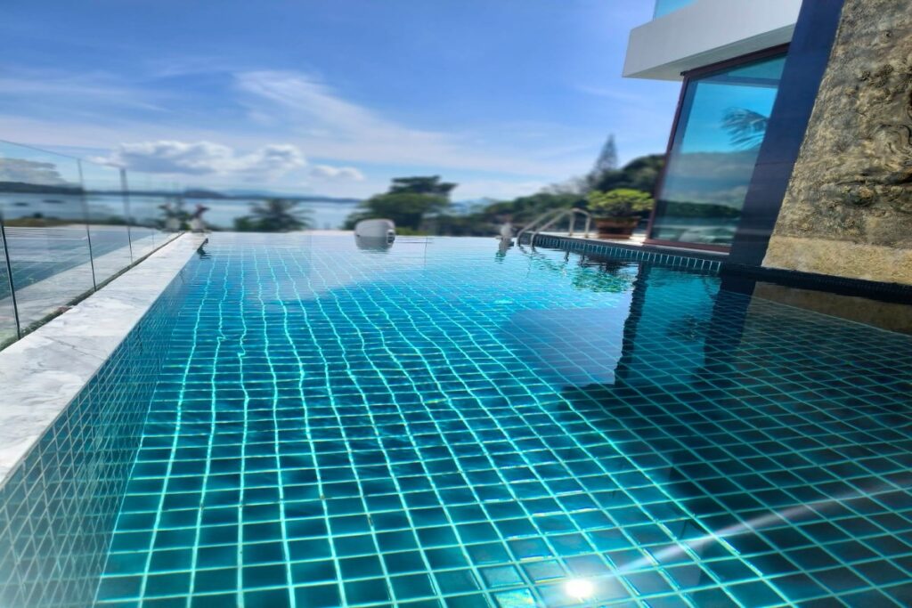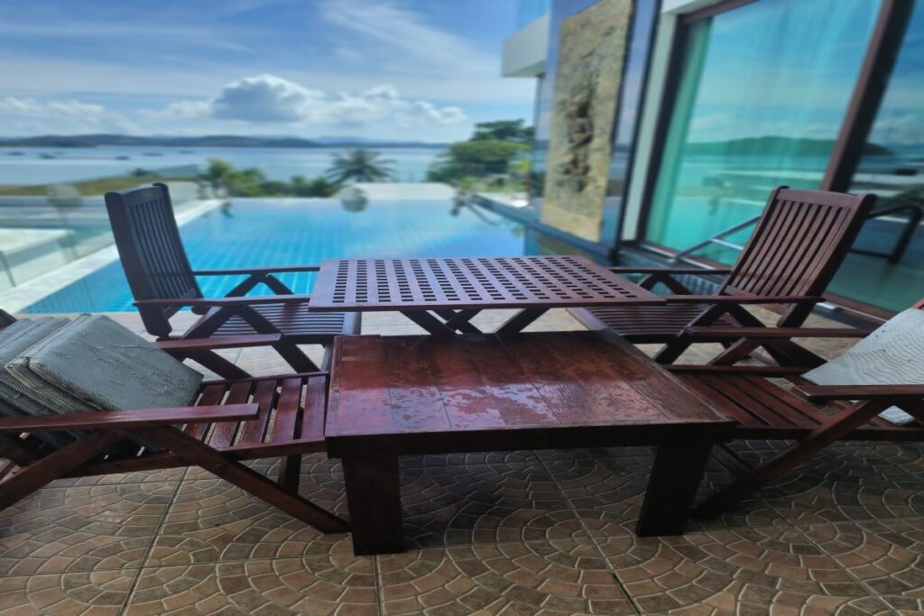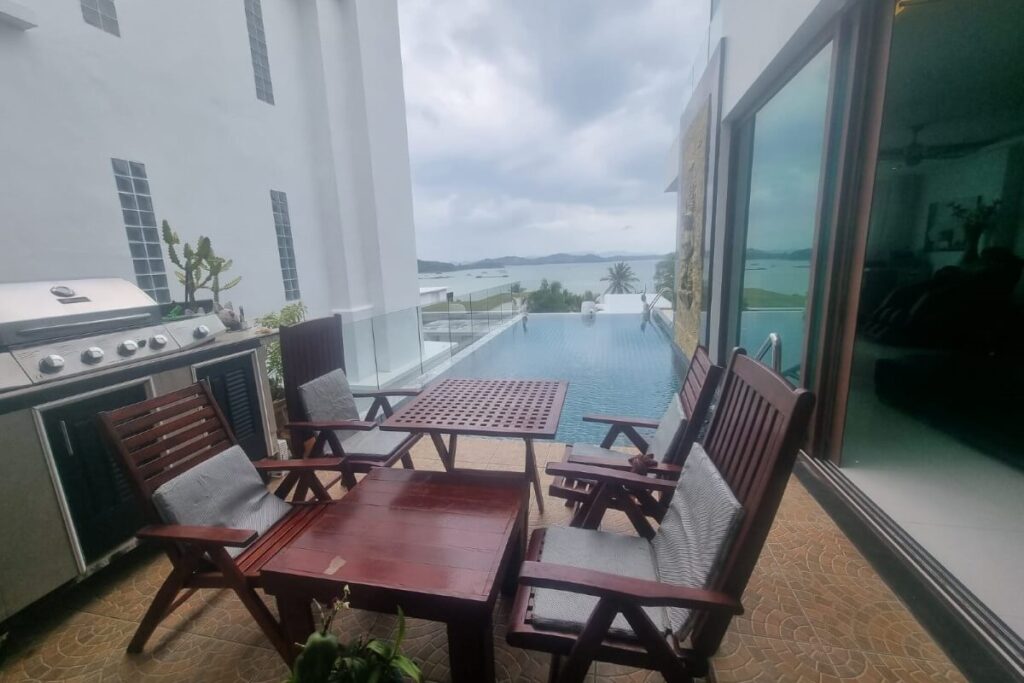 The infinity pool features a wave machine and sits alongside a pool terrace with a barbecue area, outdoor dining furniture, and a shower. Five large patios across the villa maximise ventilation and take advantage of the 180-degree views over Ao Po Bay, distant mountains, and the surrounding tropical greenery. Nine industrial air conditioning units and six remote-controlled ceiling fans keep the interior comfortable year-round. Mosquito shutters are fitted to all doors and windows.