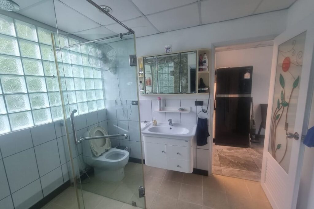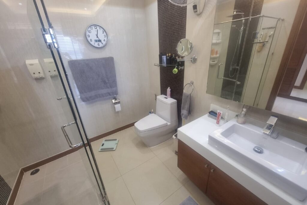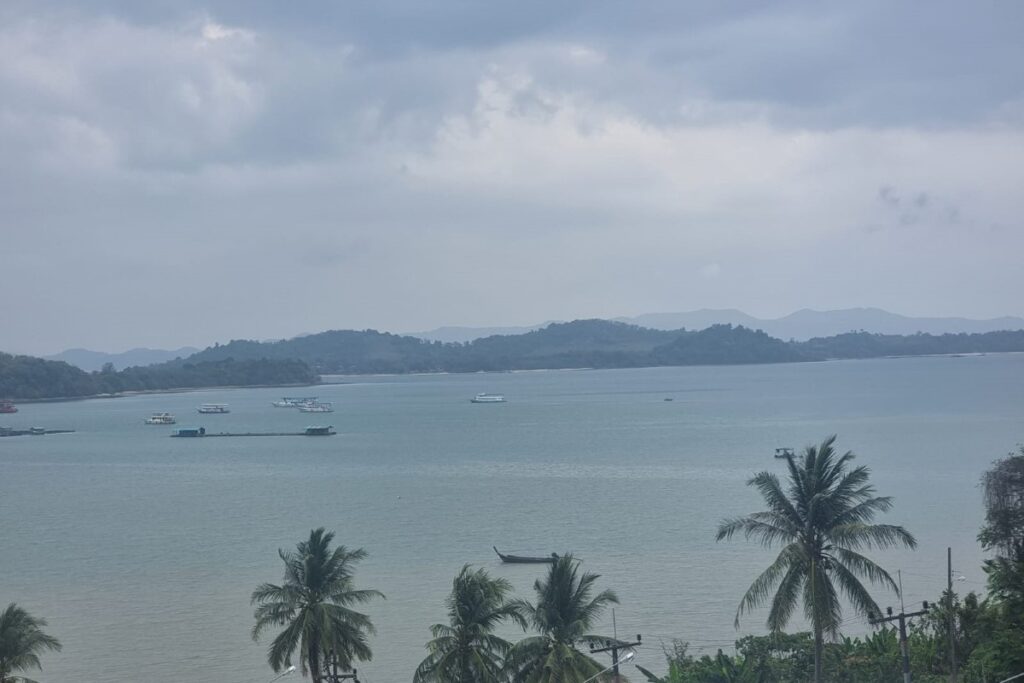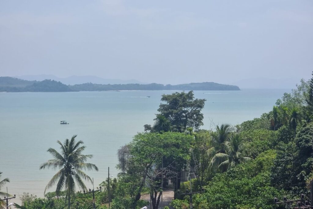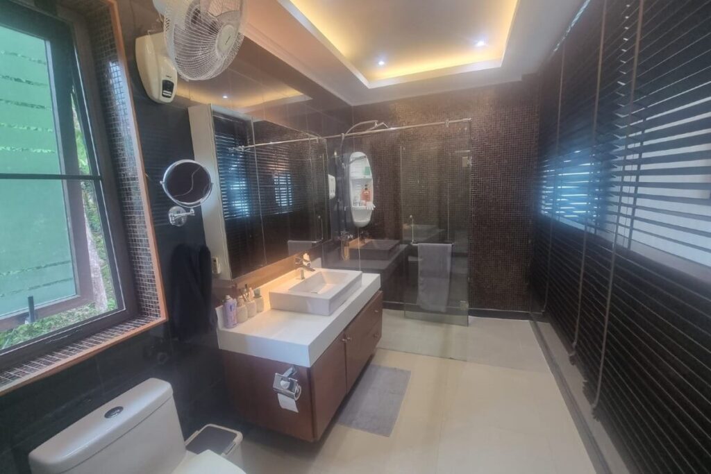 The infinity pool features a wave machine and sits alongside a pool terrace with a barbecue area, outdoor dining furniture, and a shower. Five large patios across the villa maximise ventilation and take advantage of the 180-degree views over Ao Po Bay, distant mountains, and the surrounding tropical greenery. Nine industrial air conditioning units and six remote-controlled ceiling fans keep the interior comfortable year-round. Mosquito shutters are fitted to all doors and windows.