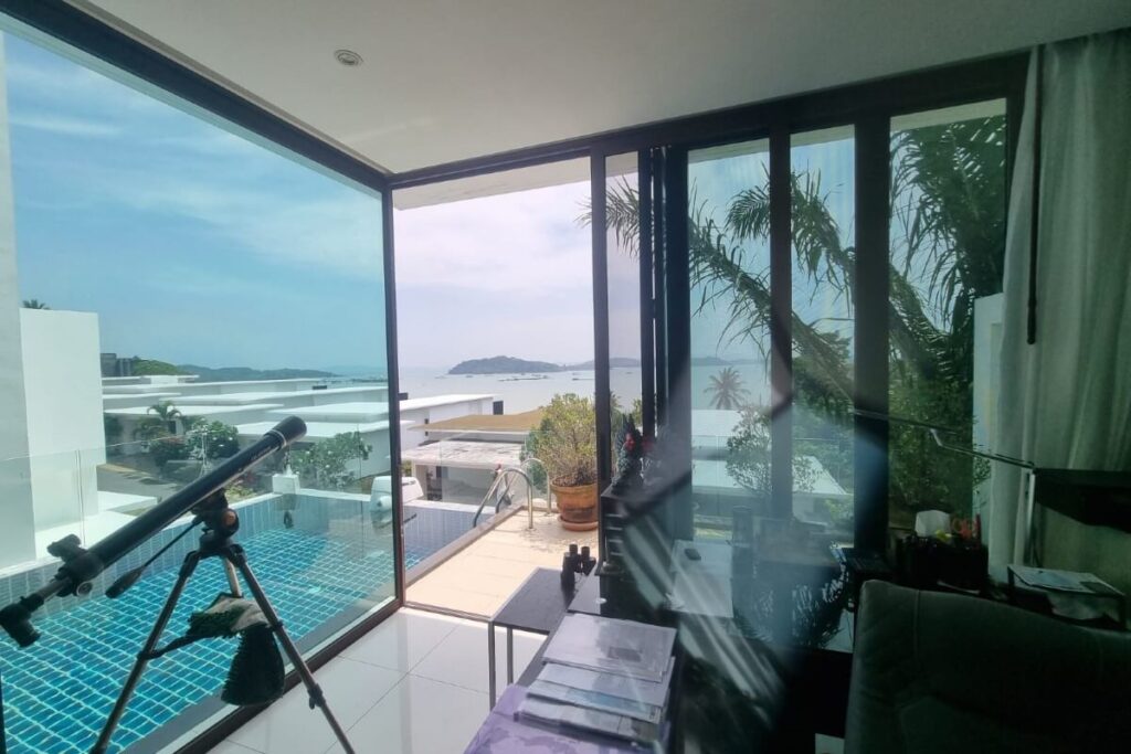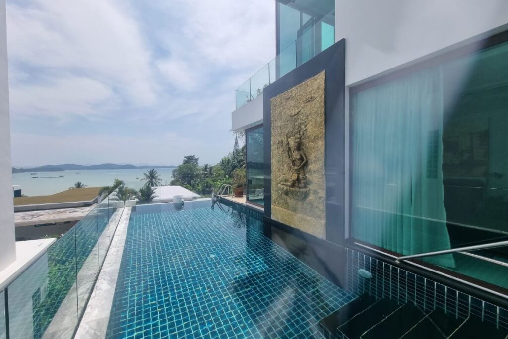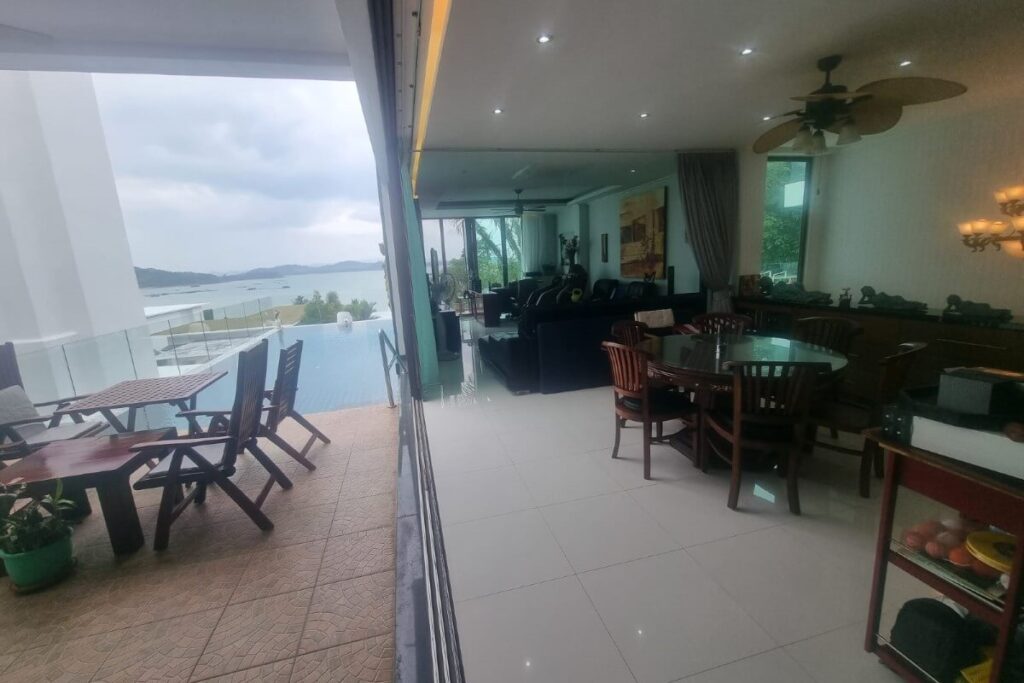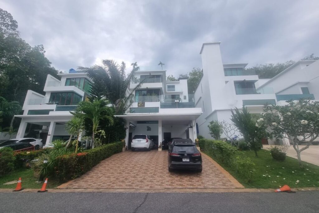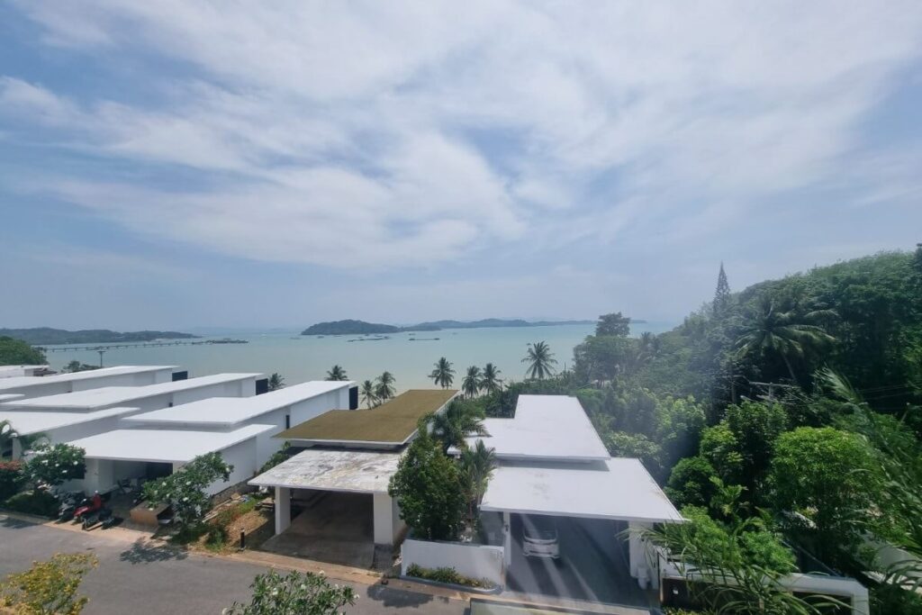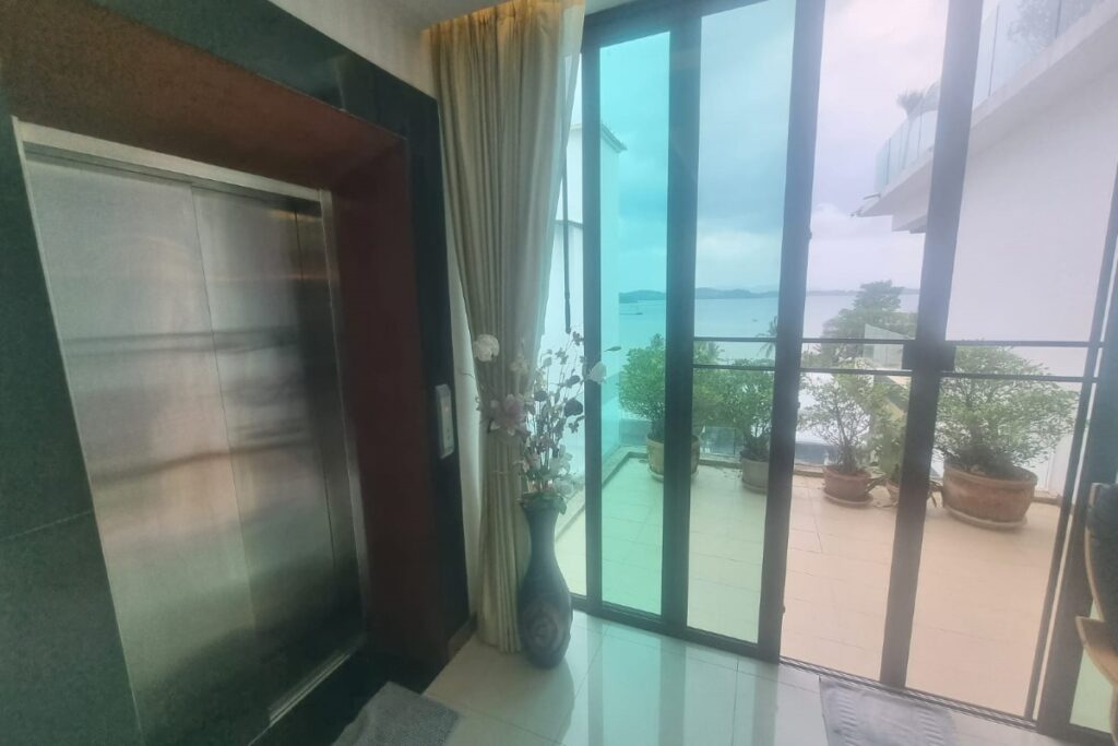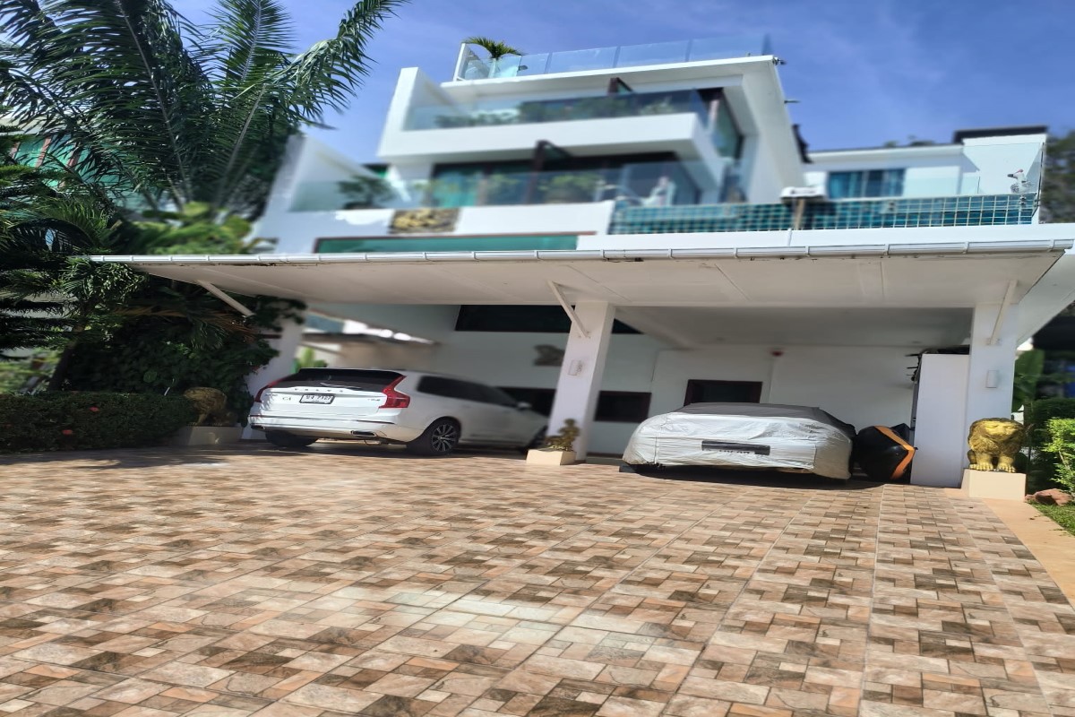 Reduced from THB 45M, this resale 6-bedroom, 6-bathroom sea view pool villa is offered for sale by the owner within a small gated community on a hillside at Ao Po Bay in Pa Klok, approximately 60 metres from the sea. The villa spans 5 storeys with a built-up area of 950 sqm and 600 sqm of interior space, and includes a private lift serving all floors. The property is available freehold or leasehold with no common area or management fees.