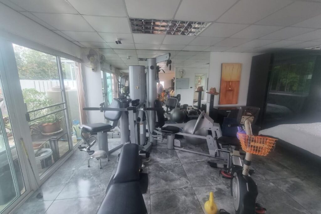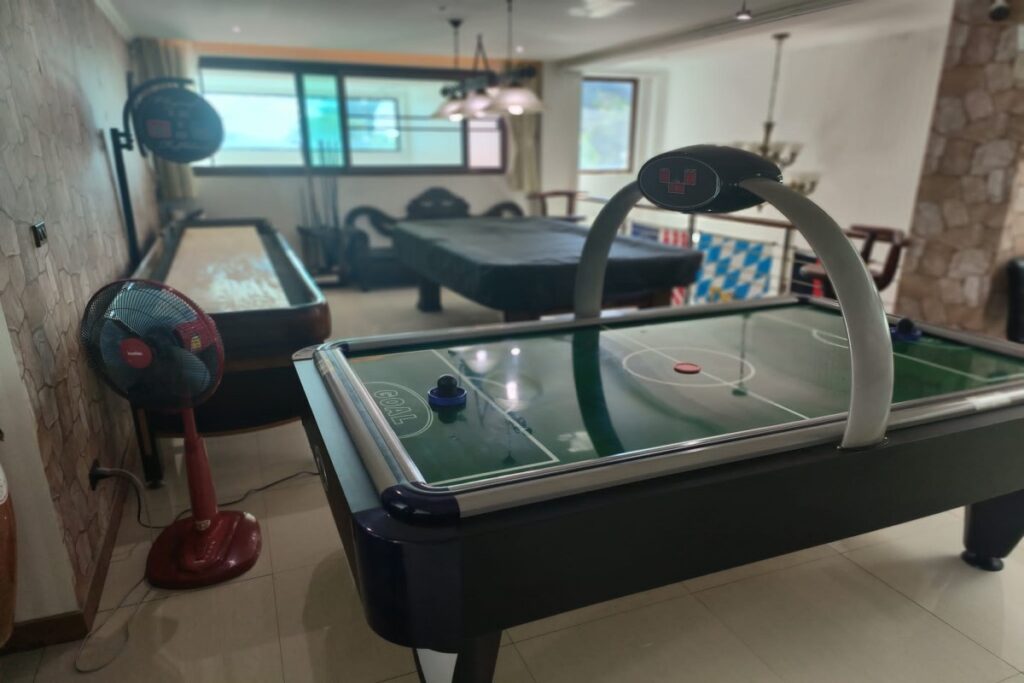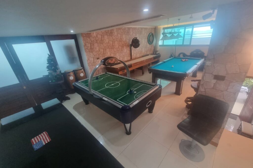 The entertainment and leisure facilities are extensive — a games room with a pool table, air hockey, shuffleboard, and a professional dart board, plus two oversized and four standard televisions with stereo and surround sound. A fully equipped gym occupies the penthouse level, and an extra-large utility room sits on one of the lower floors. The villa has three kitchens and two wet bars.