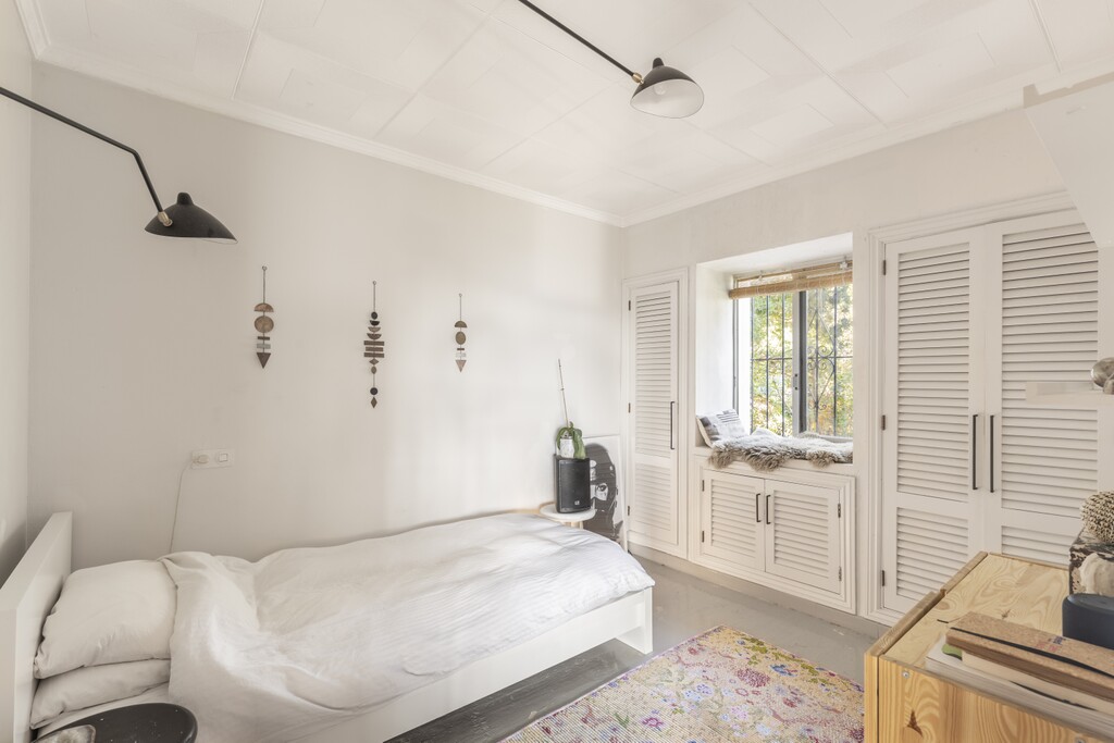 The middle floor opens into the main lounge, again with large windows oriented toward the bay. This level includes an open-plan office area, a bedroom and a dressing room on one side, and two further bedrooms and the family bathroom on the other. A laundry room is also on this floor.