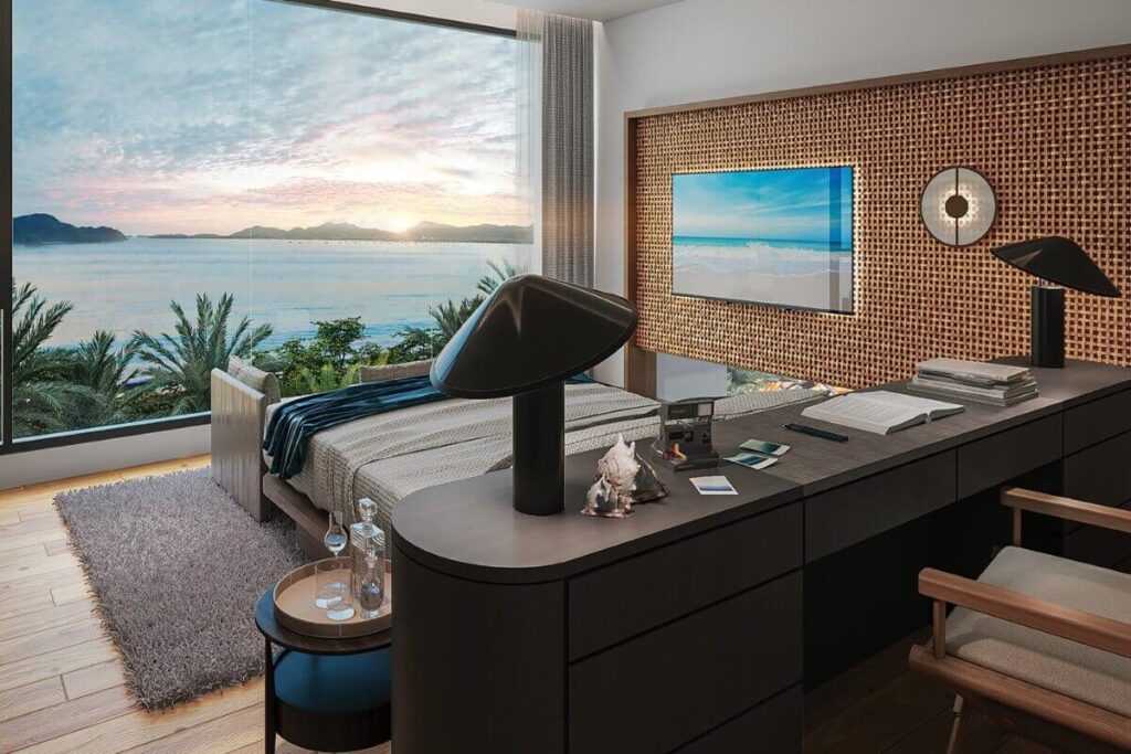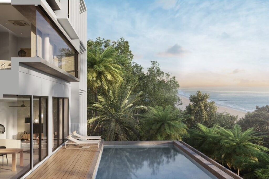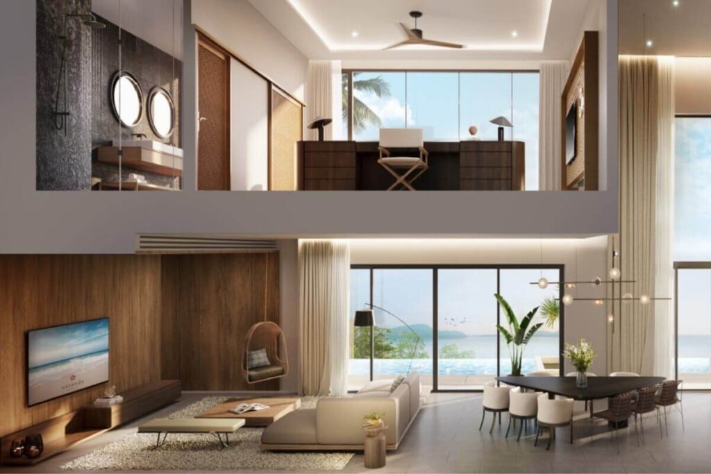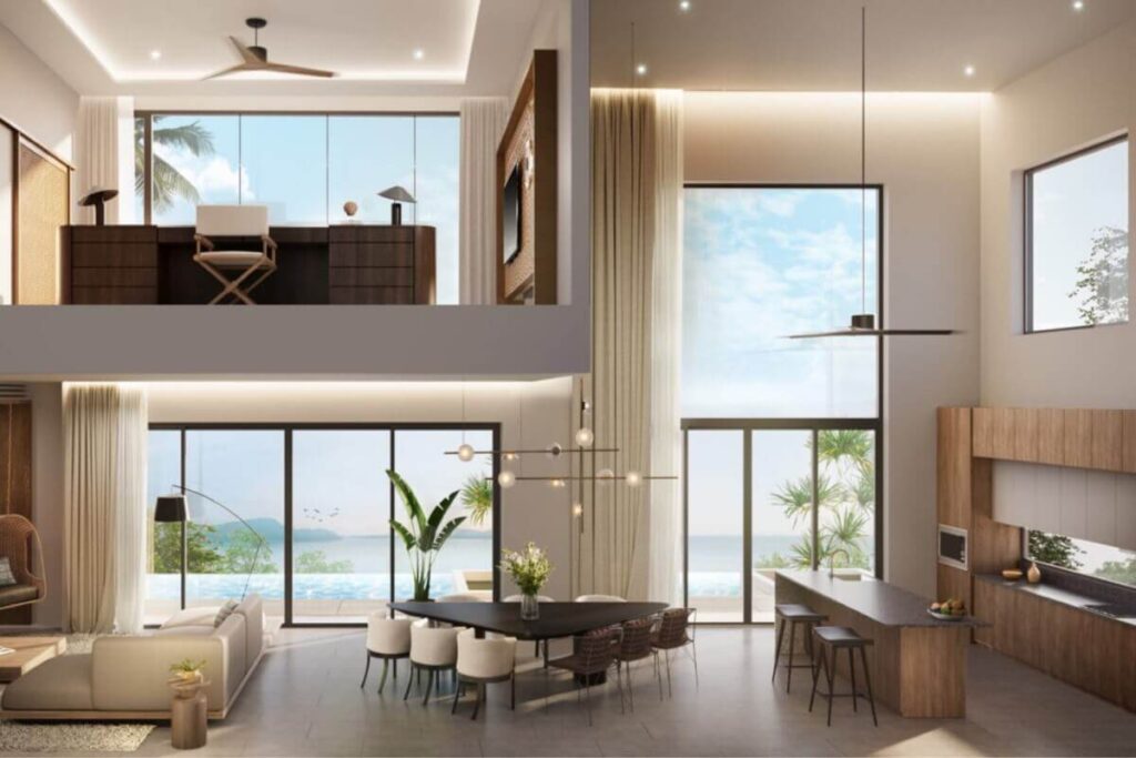 Each villa includes a private pool with panoramic sea views across the Andaman coast and direct access to the beach. Outdoor areas are designed around relaxed coastal living, with space for entertaining and family use against a backdrop of turquoise water and forested hills. A balcony, deck, and outdoor entertaining area extend the living space further. The design combines modern architecture with a strong connection to the natural surroundings, with ocean breezes, open horizons, and views across the sea, sky, and nearby mountains.