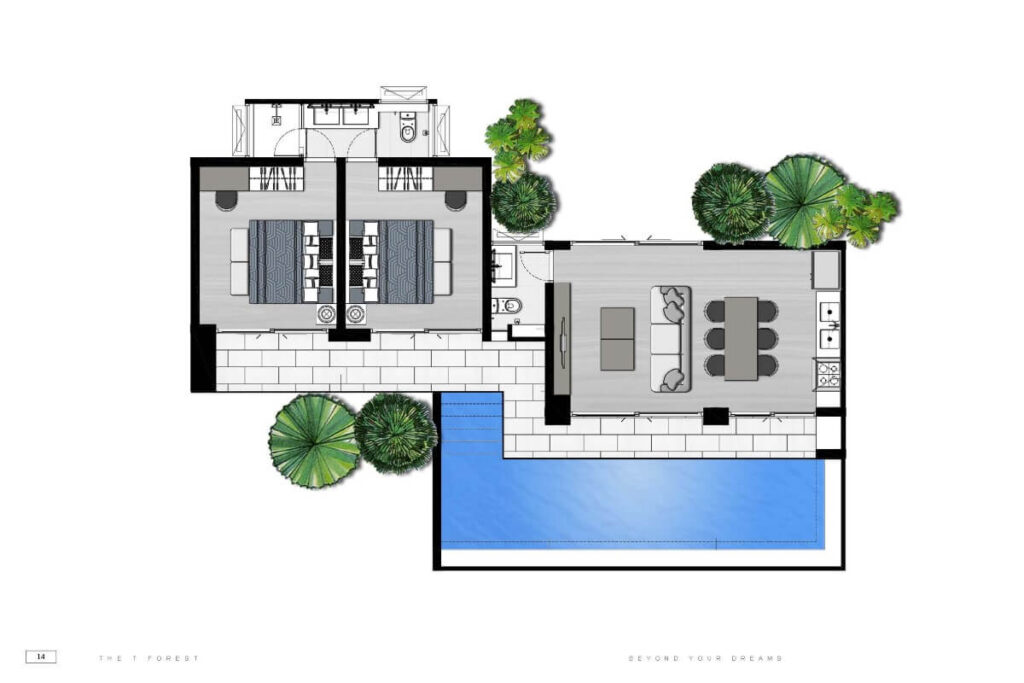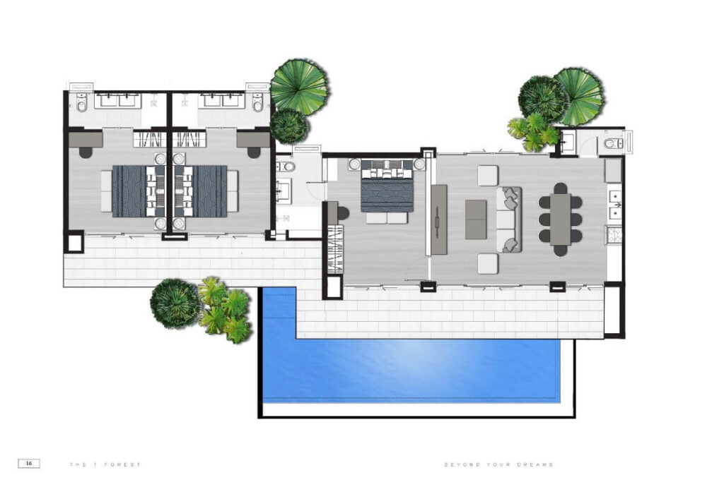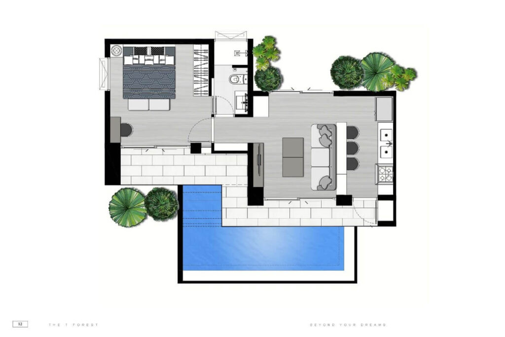 This 28-villa estate in Pa Klok offers private pool villas in 1 to 5-bedroom configurations, set across approximately 6,000 sqm of land on Phuket’s east coast near Mission Hills Golf Resort & Spa. The 1-bedroom villa provides 150 sqm of built area on a 200 sqm land plot, arranged as a fully furnished single-level residence with its own private swimming pool.