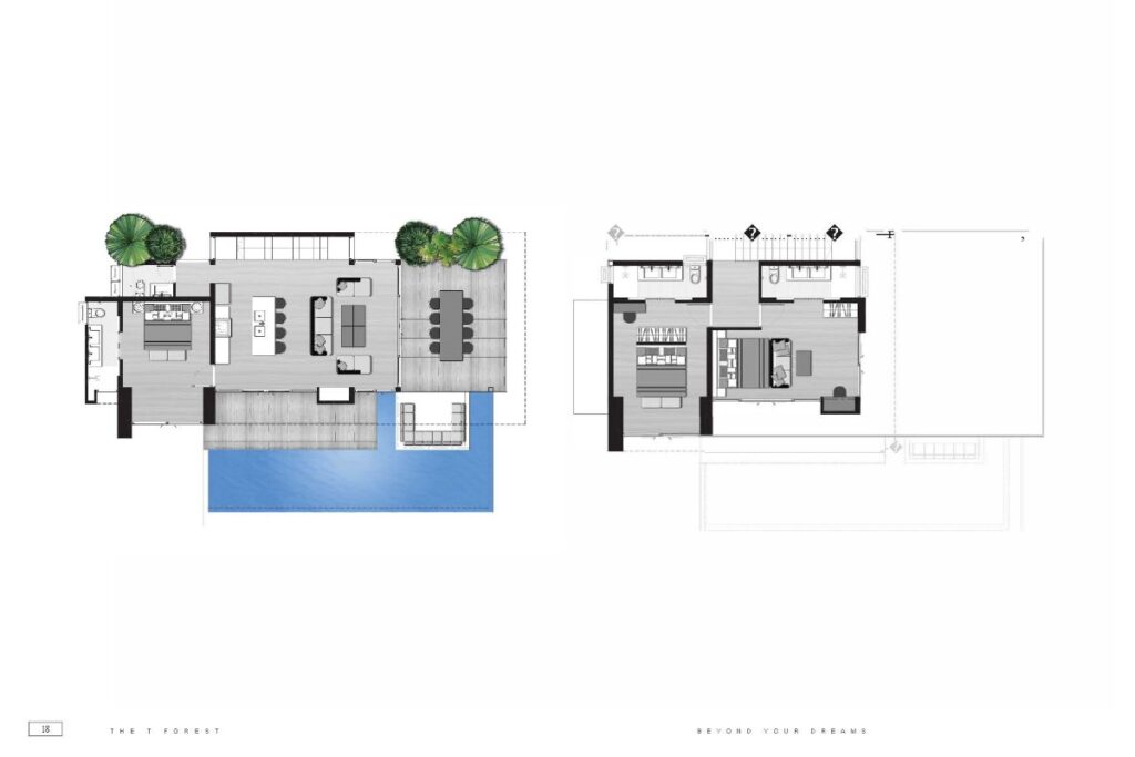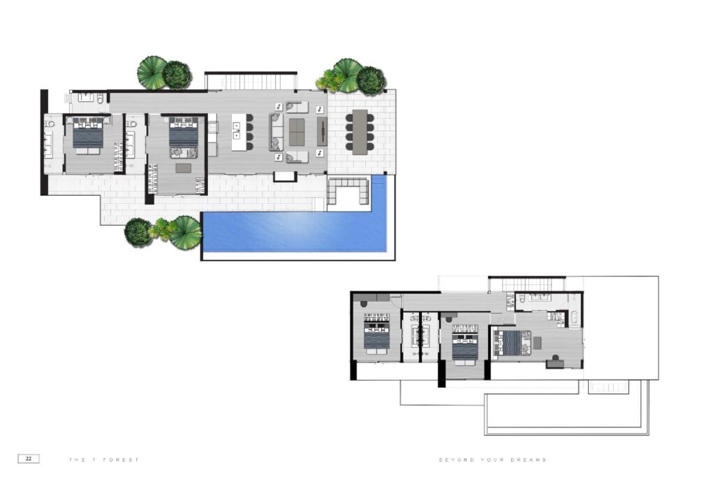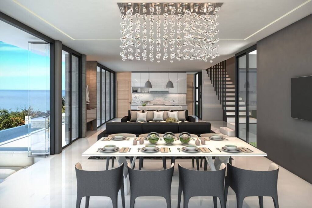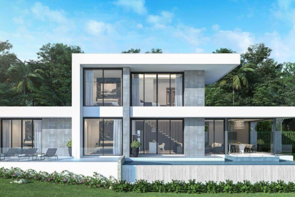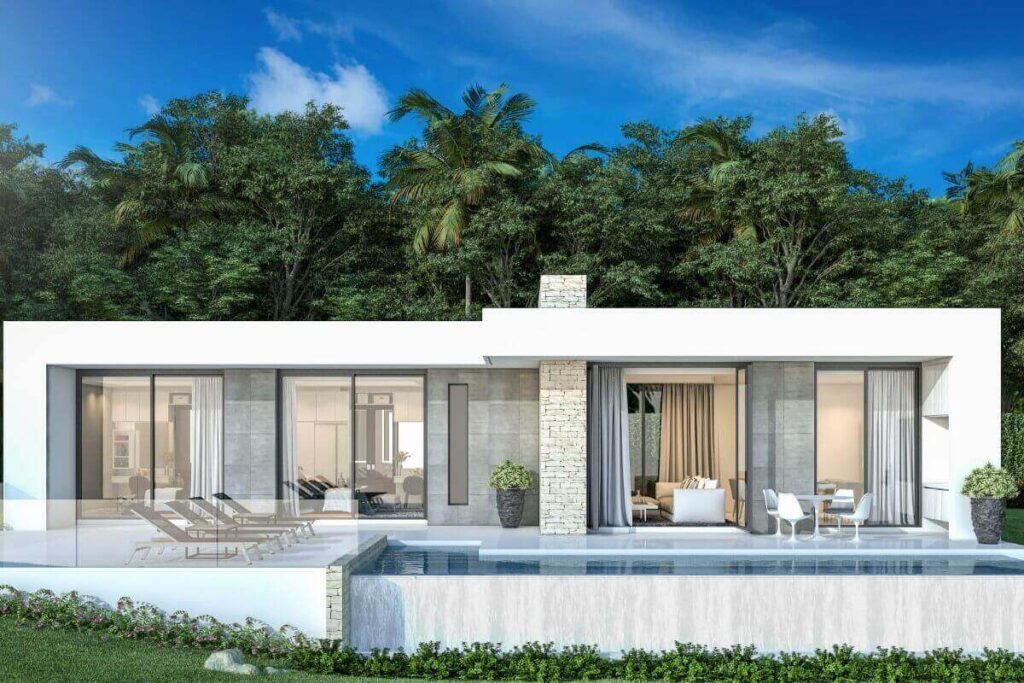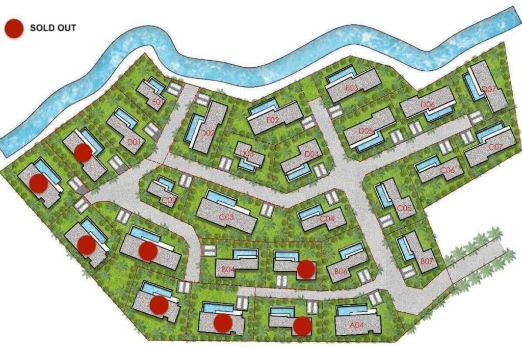Across the wider development, villa sizes range from 150 sqm for 1-bedroom homes up to approximately 440 sqm for 5-bedroom layouts. Plot sizes range from around 200 sqm to 494 sqm. The masterplan positions single-storey villas toward the front of the estate and two-storey villas toward the rear to maintain open views across the surrounding tropical greenery. Some villas within the project offer Andaman Sea views depending on position.