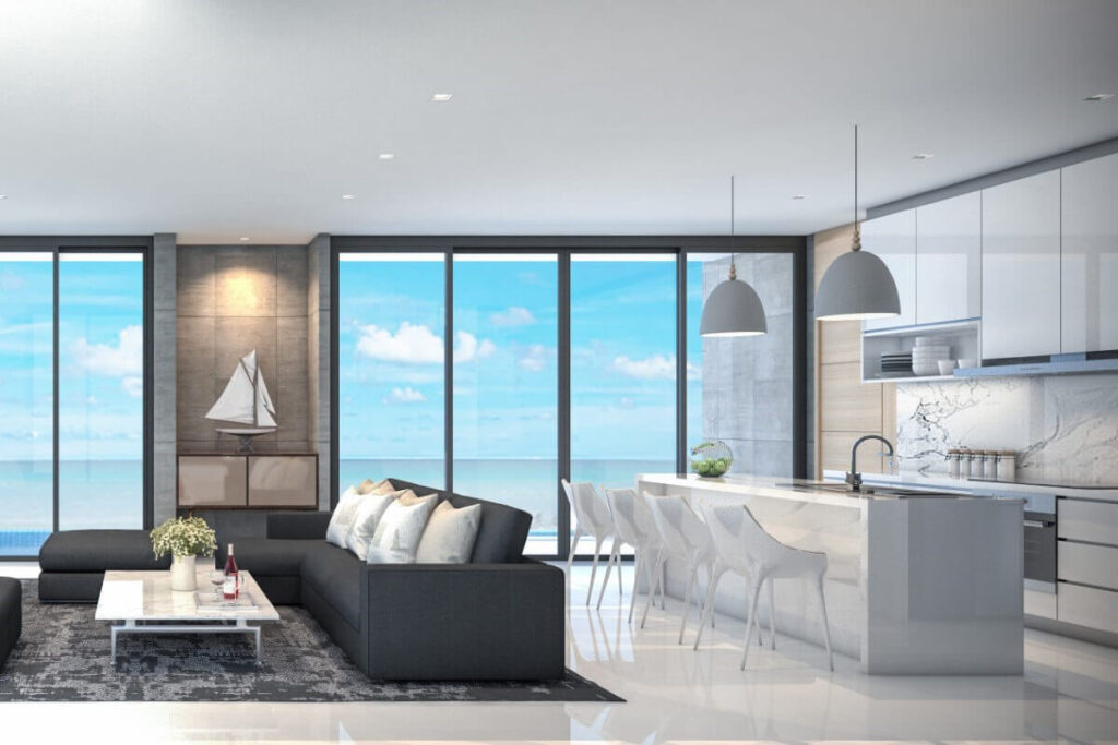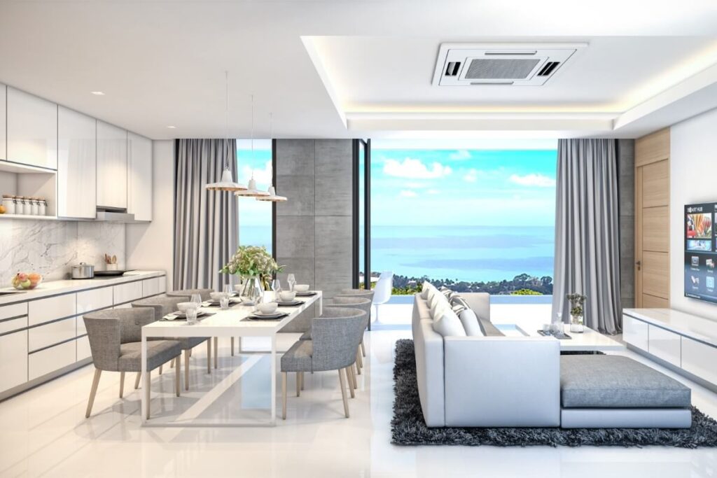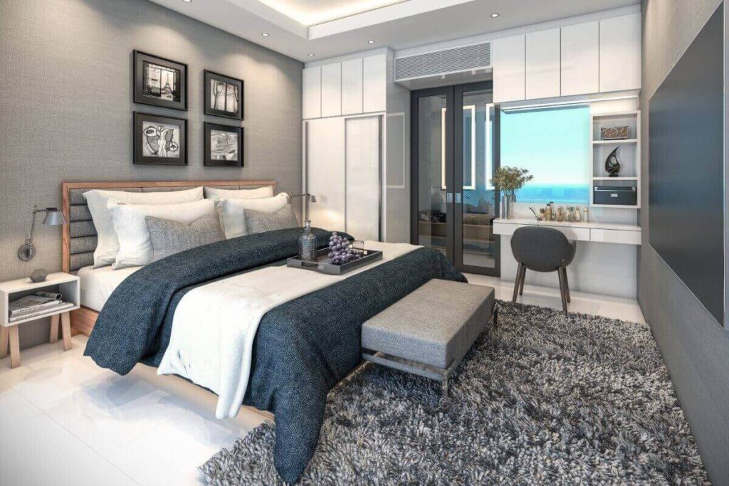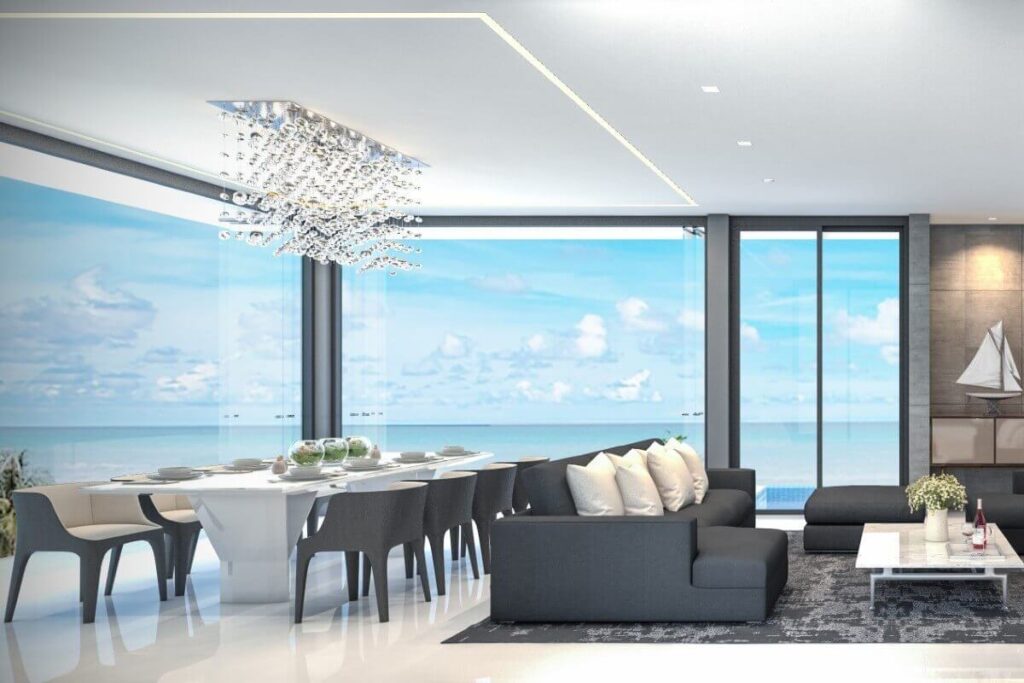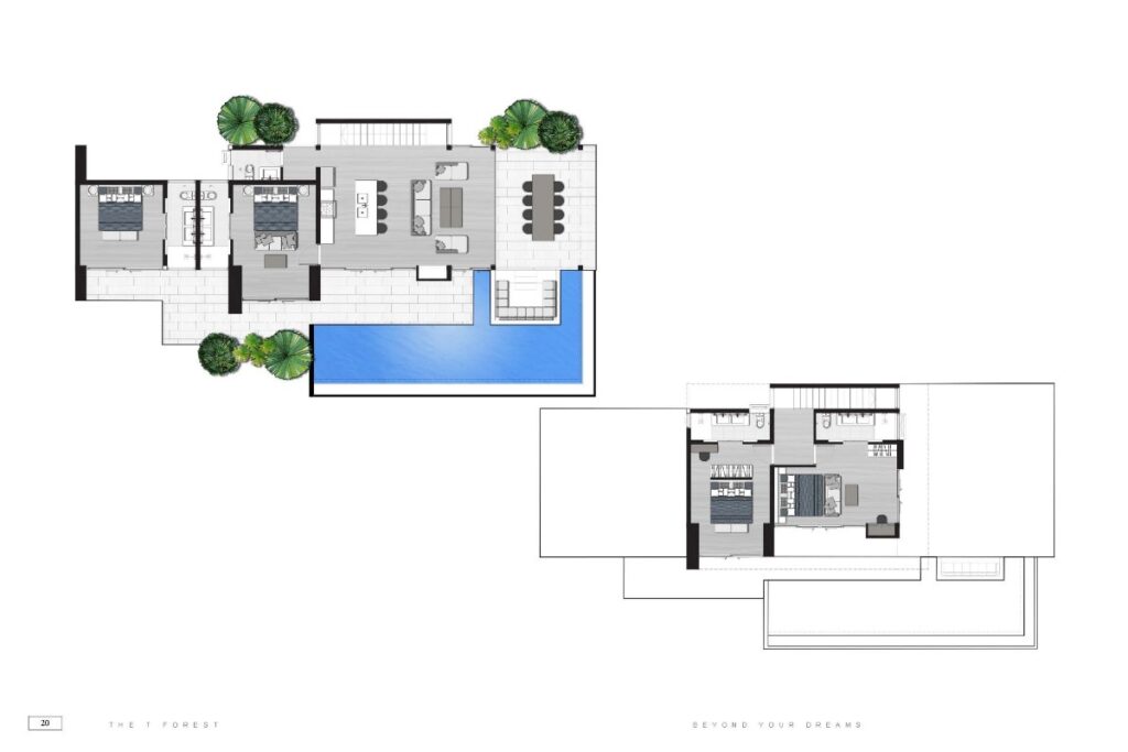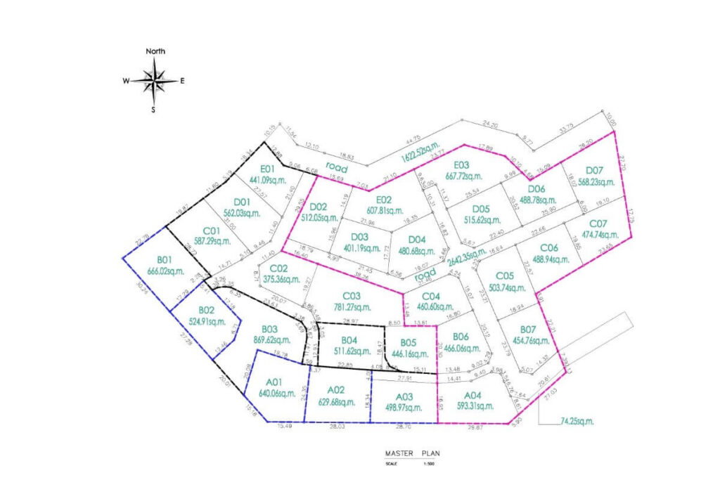Across the wider development, villa sizes range from 150 sqm for 1-bedroom homes up to approximately 440 sqm for 5-bedroom layouts. Plot sizes range from around 200 sqm to 494 sqm. The masterplan positions single-storey villas toward the front of the estate and two-storey villas toward the rear to maintain open views across the surrounding tropical greenery. Some villas within the project offer Andaman Sea views depending on position.