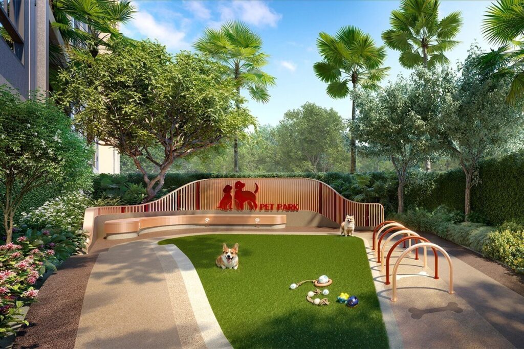 Facilities are centred around everyday practicality and lifestyle use. Residents have access to a lobby and reception area, landscaped gardens, a swimming pool, fitness centre, onsen, co-kitchen and co-working space. A dedicated pet park forms part of the shared amenities, supporting the development’s pet-friendly positioning. Secure parking is integrated into the project.