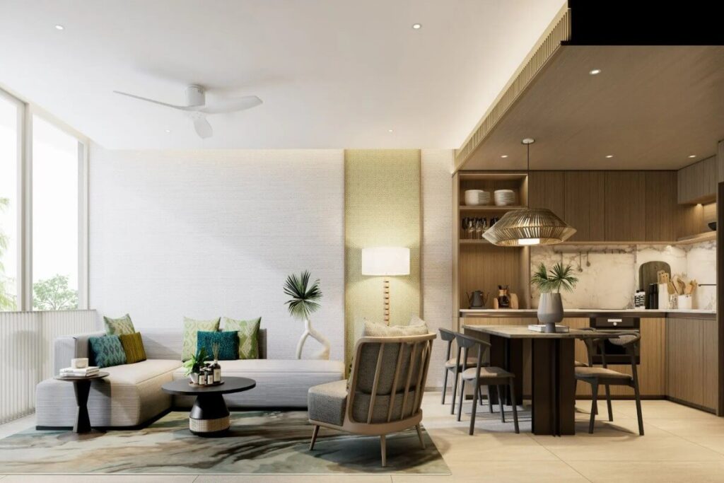The one-bedroom units measure 57–58 sqm and are ideal for singles or couples seeking a compact beachfront home. Each unit comes fully furnished with premium fittings and finishes. The larger two-bedroom condos, ranging from 113–115 sqm, include two en-suite bedrooms and a spacious living-dining area with a wide balcony. Across both phases, the development offers 51 residences, including ten two-bedroom penthouses with private pools.