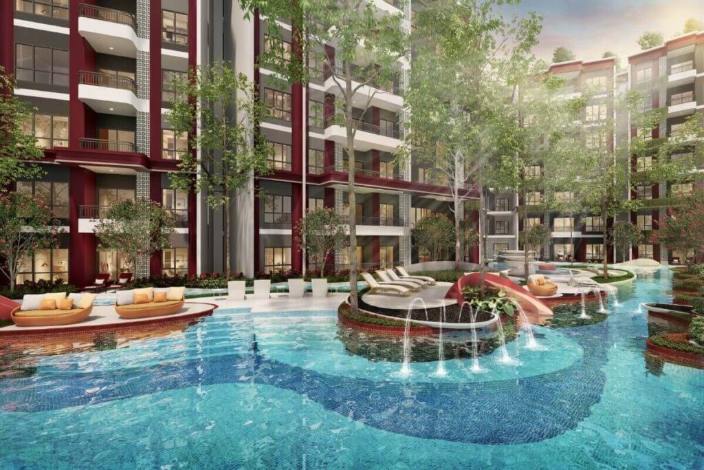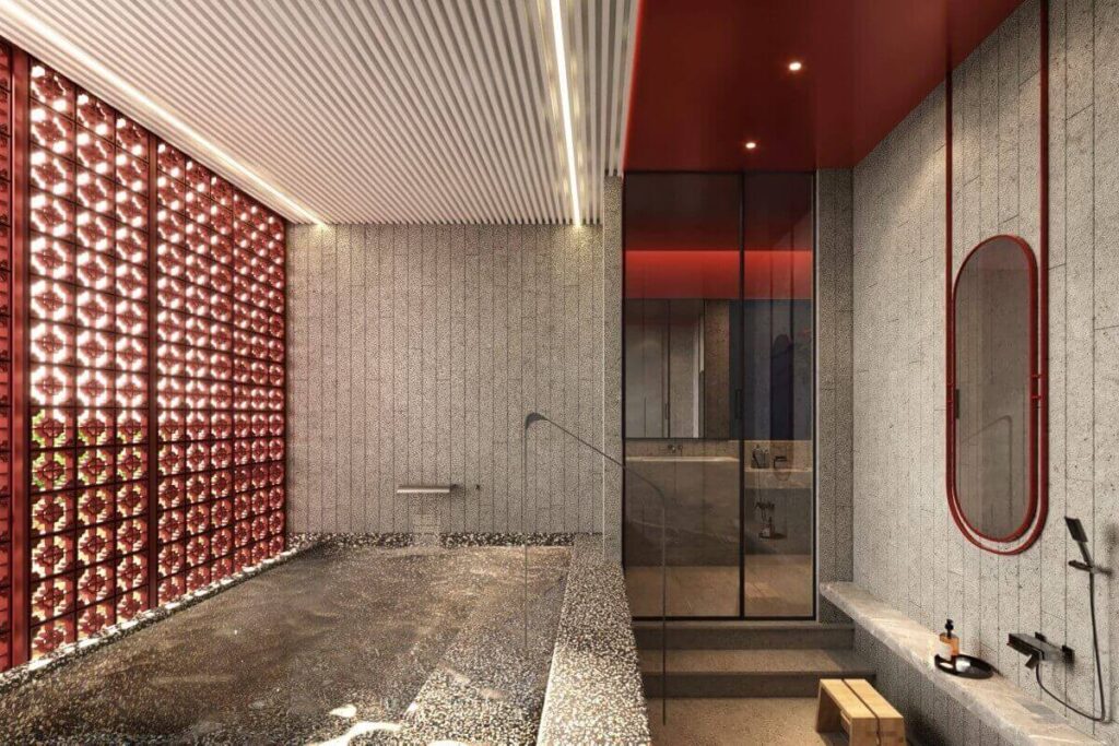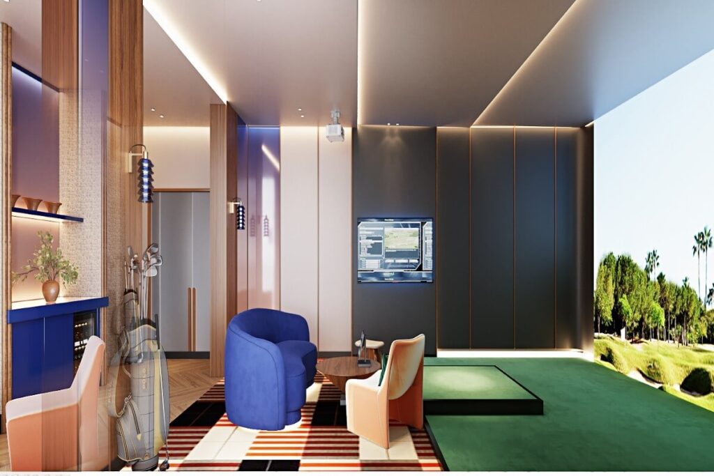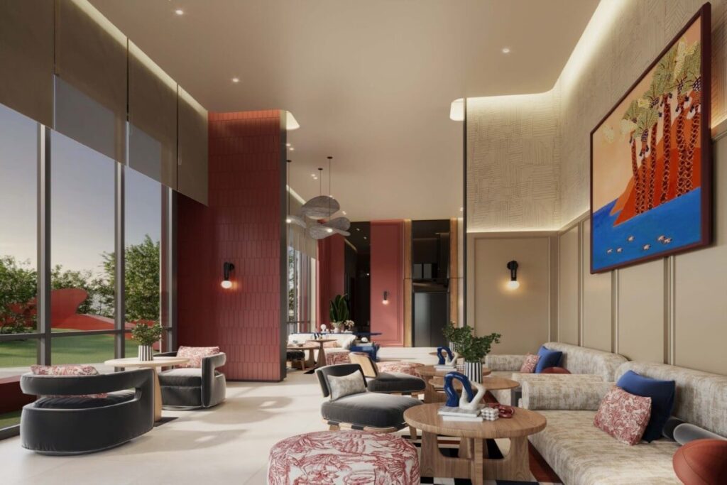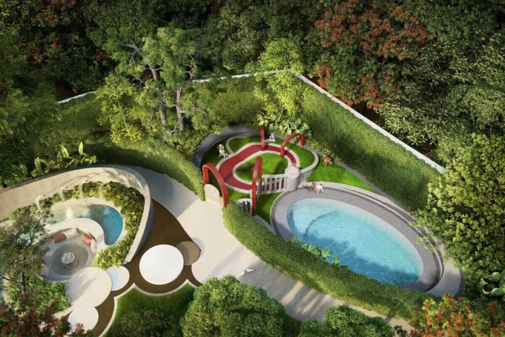 The development stands out for its extensive facilities. Residents have access to 19 indoor and 22 outdoor amenities, including multiple swimming pools for adults, children, and pets. A fitness centre, onsen, boxing area, golf simulator, cinema, and co-working spaces add real depth to the lifestyle offering. The landscaped grounds incorporate floating terraces, waterfall features, and outdoor recreation areas designed for both relaxation and community interaction.