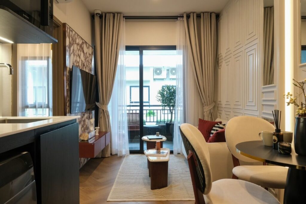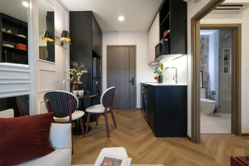 Set within four seven-storey buildings across a 10,690 sqm site, the development offers a wide selection of one-bedroom layouts. The 29–40 sqm units are efficiently planned and fully furnished, while the 58 sqm one-bedroom plus layouts include flexible living zones suited for a home office or extra storage. Duplex configurations of 61–63 sqm provide a dramatic double-height design across two levels, combining style and practical comfort.