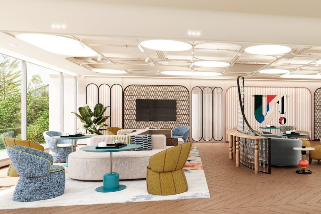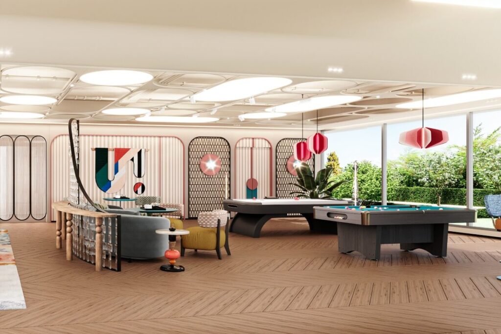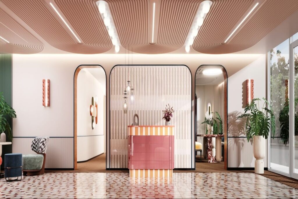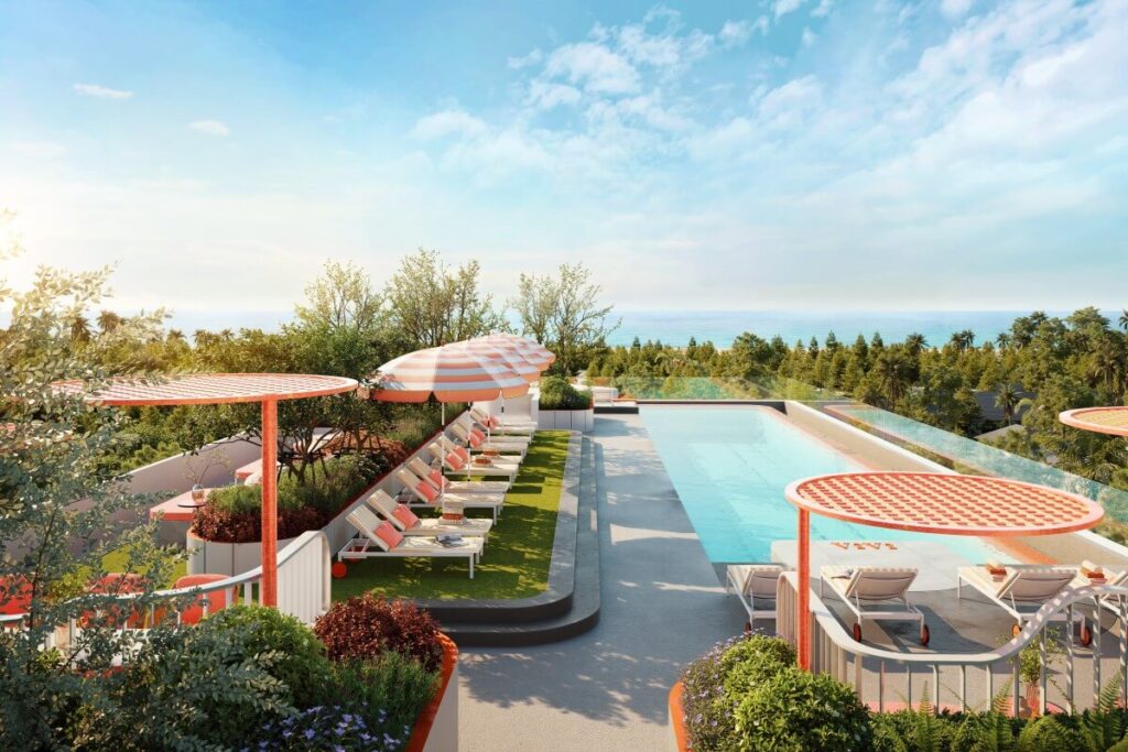 Positioned just one kilometre from Bang Tao Beach, the development captures the energy of the area’s beach-club lifestyle while maintaining a sense of privacy and modern comfort. The architecture blends smooth white forms and soft coral accents, creating a playful yet elegant visual identity inspired by the coastal surroundings.