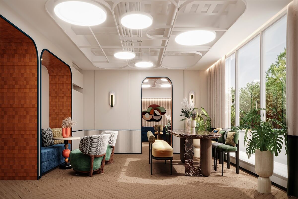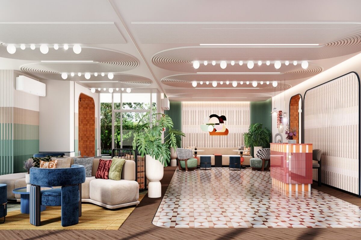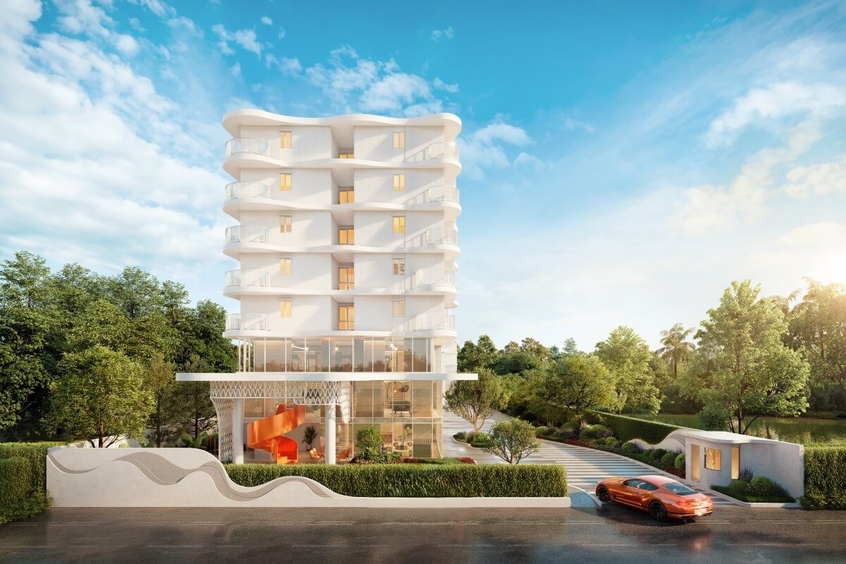 Positioned just one kilometre from Bang Tao Beach, the development captures the energy of the area’s beach-club lifestyle while maintaining a sense of privacy and modern comfort. The architecture blends smooth white forms and soft coral accents, creating a playful yet elegant visual identity inspired by the coastal surroundings.