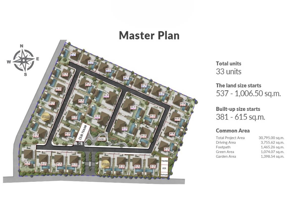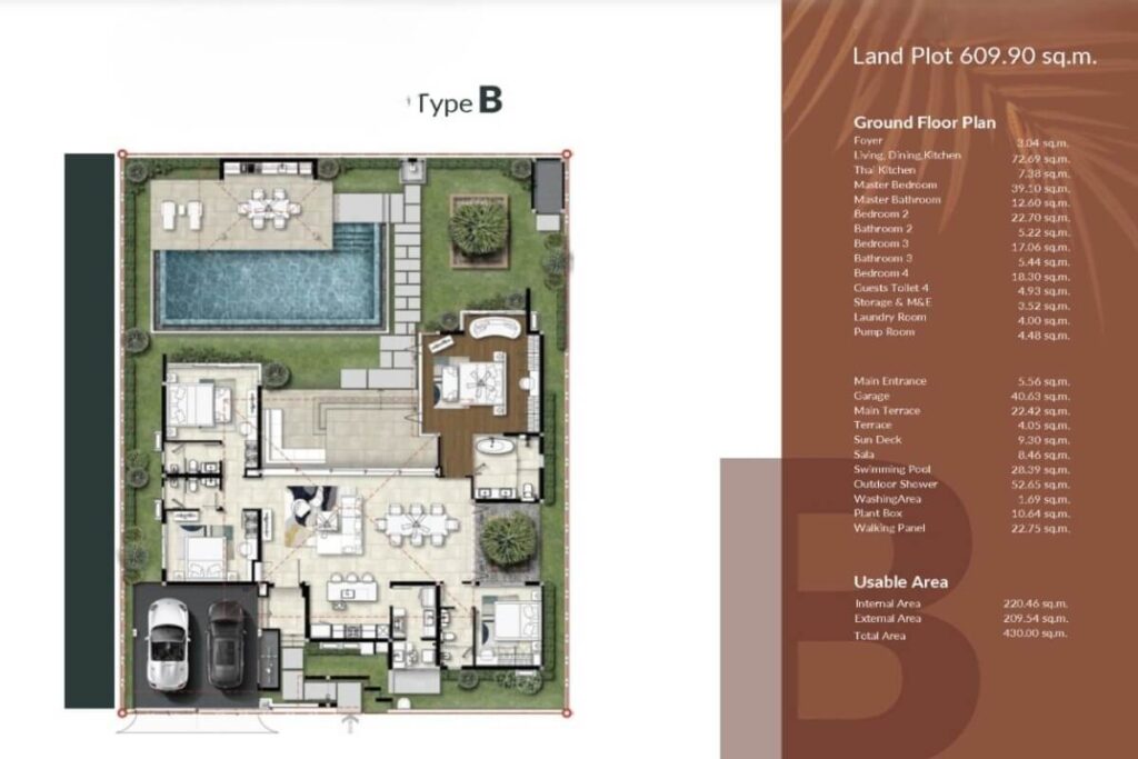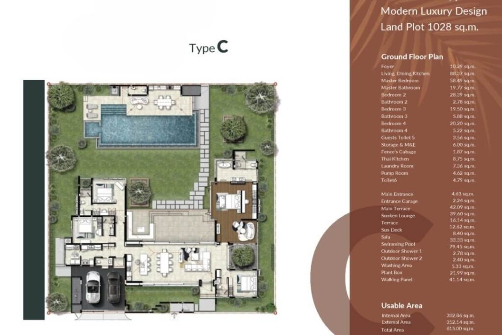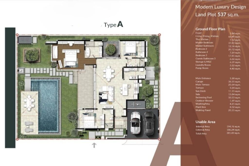 Built-up areas range from 380 sqm to 615 sqm across three layout types, positioned on plots from 537 sqm to 1,006.50 sqm. Each villa follows a U-shaped configuration centred around a covered main terrace, reinforcing indoor-outdoor connectivity. The open-plan living, dining, and kitchen area flows directly toward the terrace, while a separate Thai kitchen provides additional functional space. Two bedrooms open directly onto the terrace while maintaining internal access, with the remaining bedroom positioned toward the rear for added privacy.