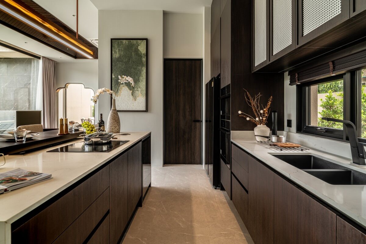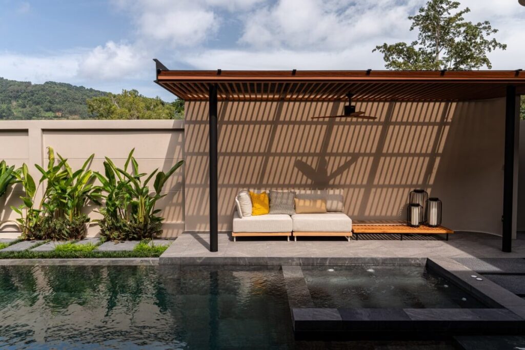 Outdoor areas are designed to maximise usable space within landscaped plots. Private swimming pools range from 33 sqm to 46 sqm, each with a uniform depth of 1.4 metres. A 12.5 sqm lotus pond, poolside pavilion or sala, and two-car parking are included within each property. Gardens are arranged to complement the pool terrace while maintaining privacy within the development.