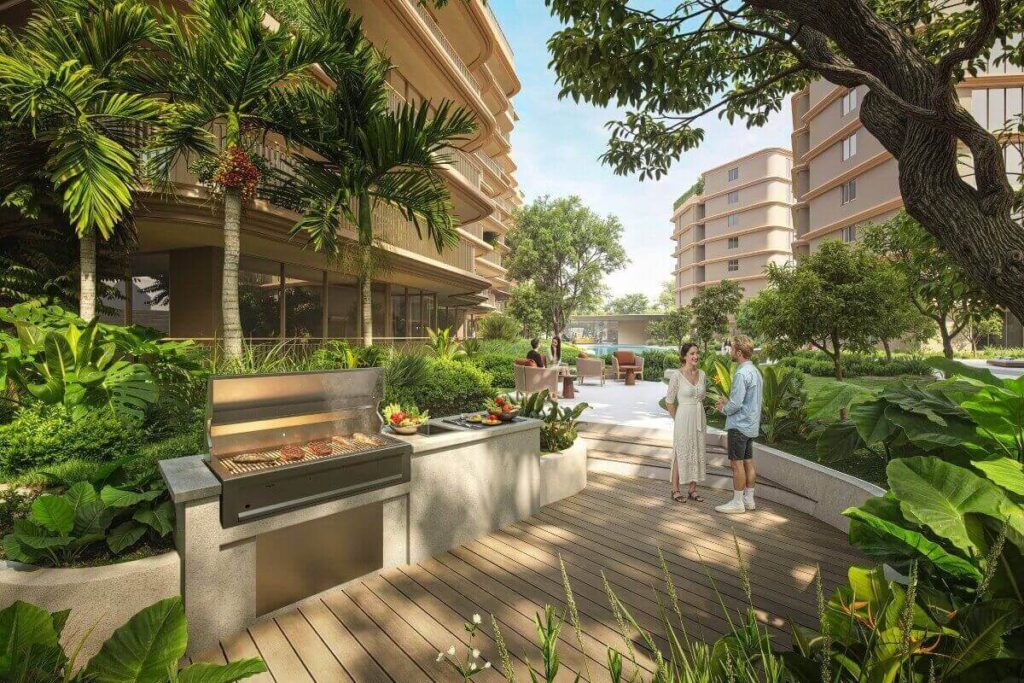 Five interconnected low-rise buildings make up the development, arranged in a distinctive finger-shaped pattern that maximises privacy and views across the golf course. Buildings C and D contain 120 residences of 1–3 bedrooms, all oriented toward open greenery.