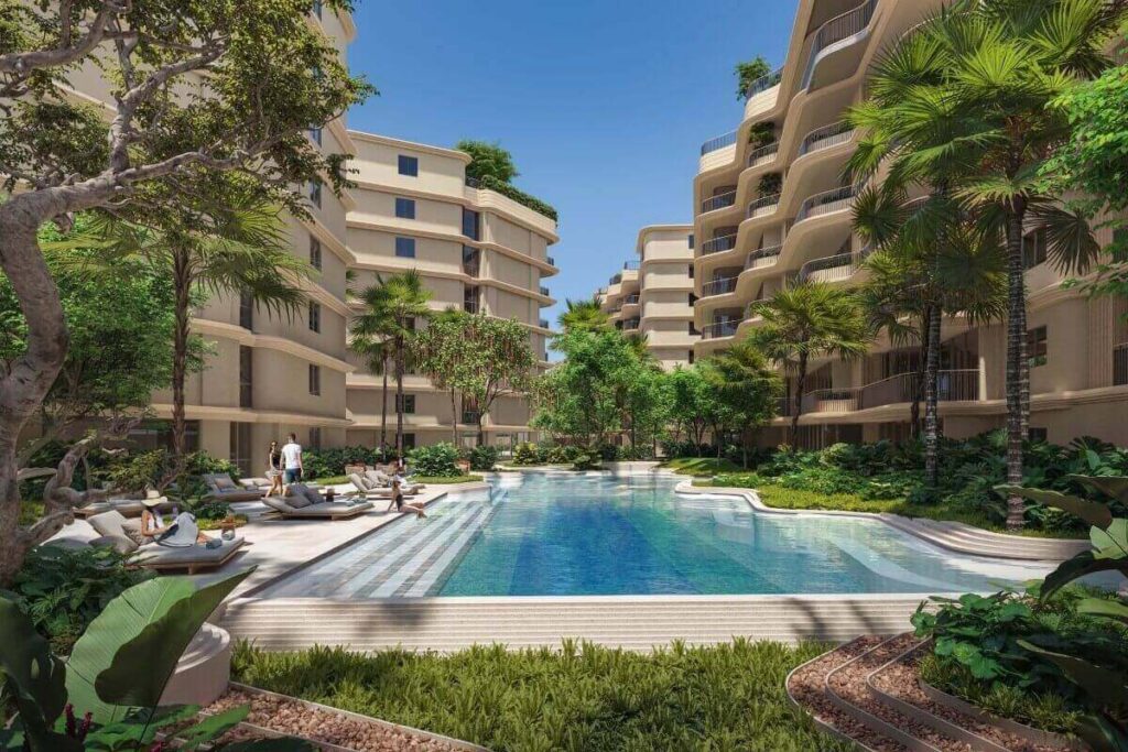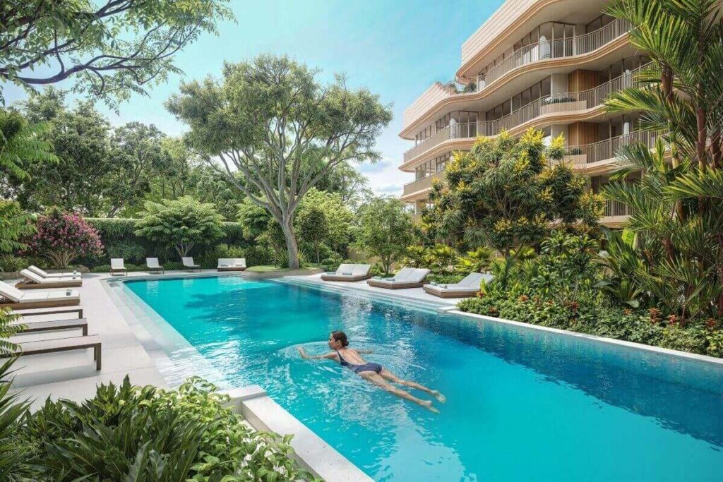 The 229 sqm layouts include duplex penthouses and single-level ground-floor homes. Penthouses feature rooftop pools with panoramic fairway views, while garden units open directly to private pools and landscaped outdoor terraces. Interiors are light and airy, designed around open-plan living and dining areas that flow naturally into wide balconies.
