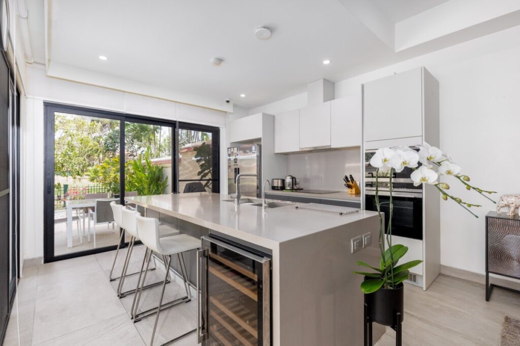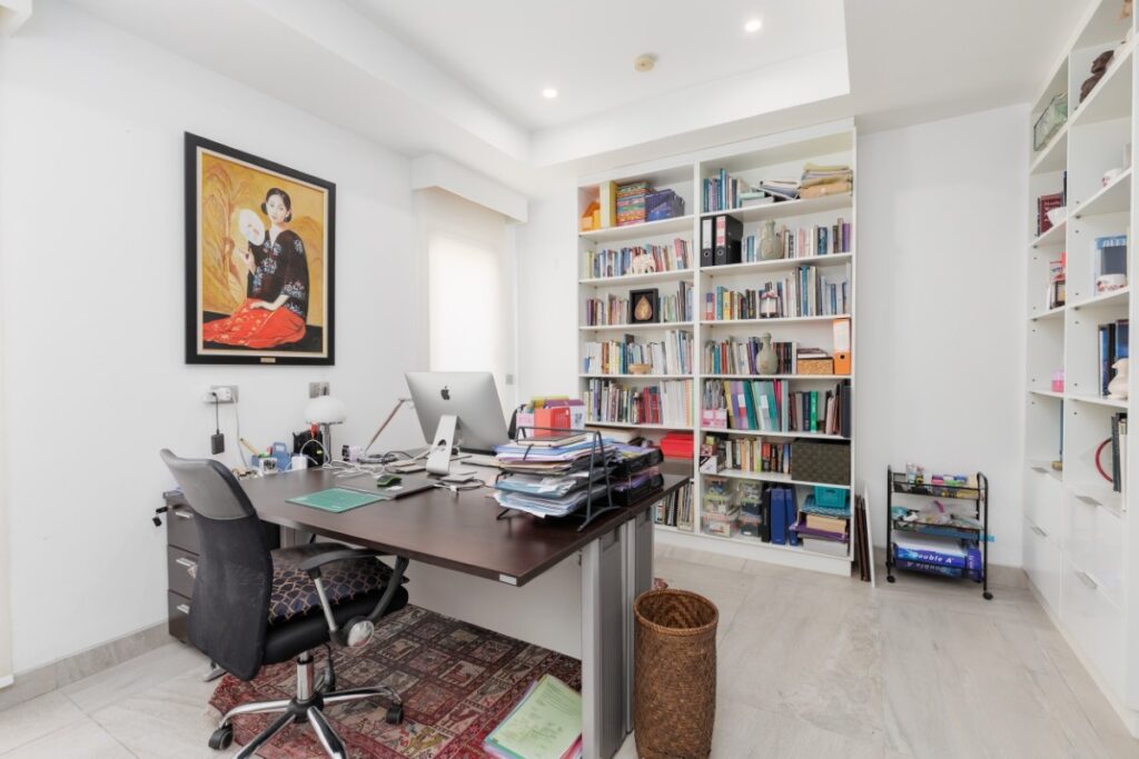 The ground floor is arranged around an open-plan living, dining and kitchen area. Floor-to-ceiling glass walls and sliding doors open directly onto the outdoor terrace, garden and private pool, creating a continuous connection between indoor and outdoor spaces. The lake-facing kitchen is equipped with Western appliances including a dishwasher. Also on this level are a guest bathroom, a storeroom and a former maid’s room which now functions as a study with its own bathroom and air conditioning.