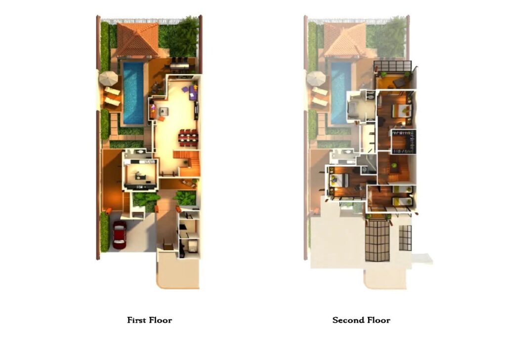 Outdoor areas are arranged around a private swimming pool facing the lagoon. The terrace and poolside sala create a shaded entertaining area while landscaped garden pockets add greenery to the 480 sqm plot. Two covered parking spaces are also provided within the property.