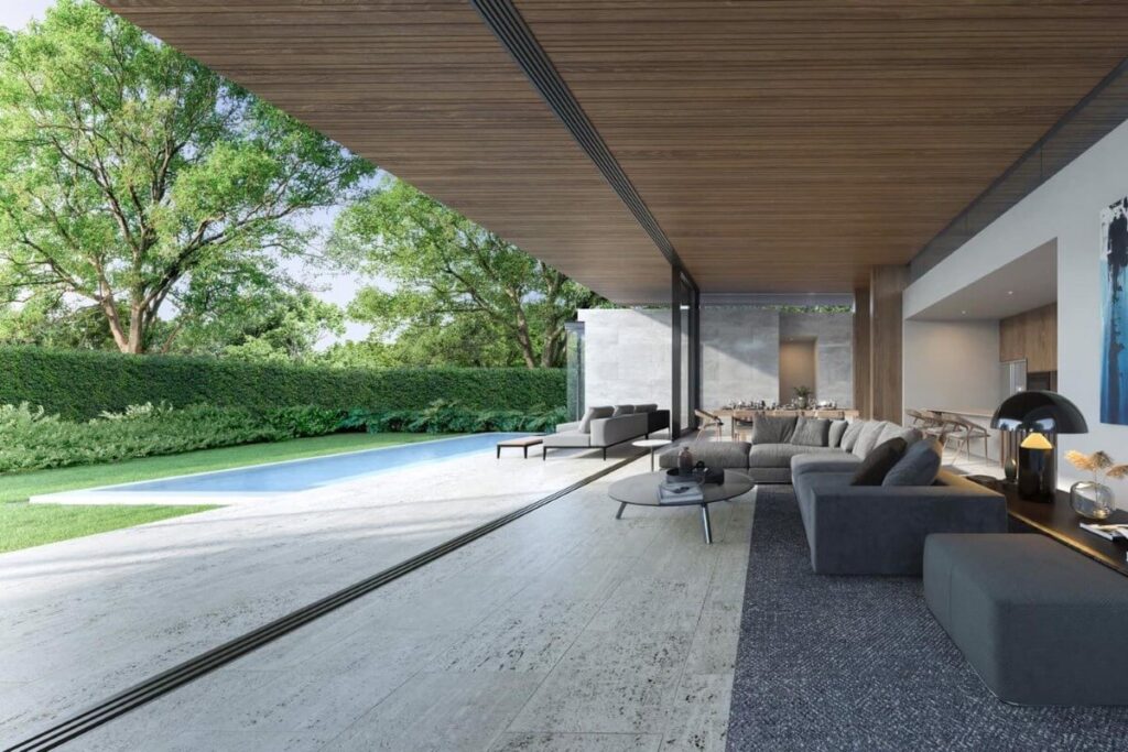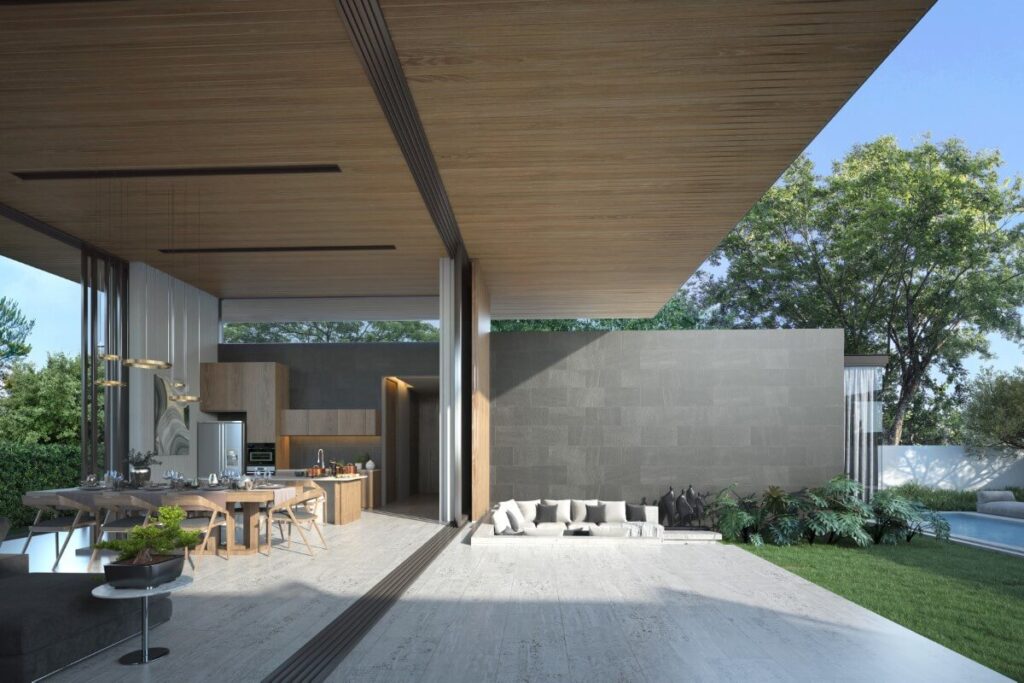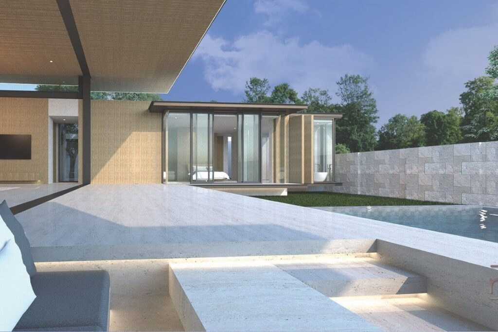 Each villa is built to blend seamlessly with its surroundings. The floor plan flows around a natural stone-tiled pool, framed by concertina glass doors and vaulted teak ceilings that create a sense of openness. Soft interior tones and organic materials give the homes a calm and balanced atmosphere, while large windows frame the greenery outside.