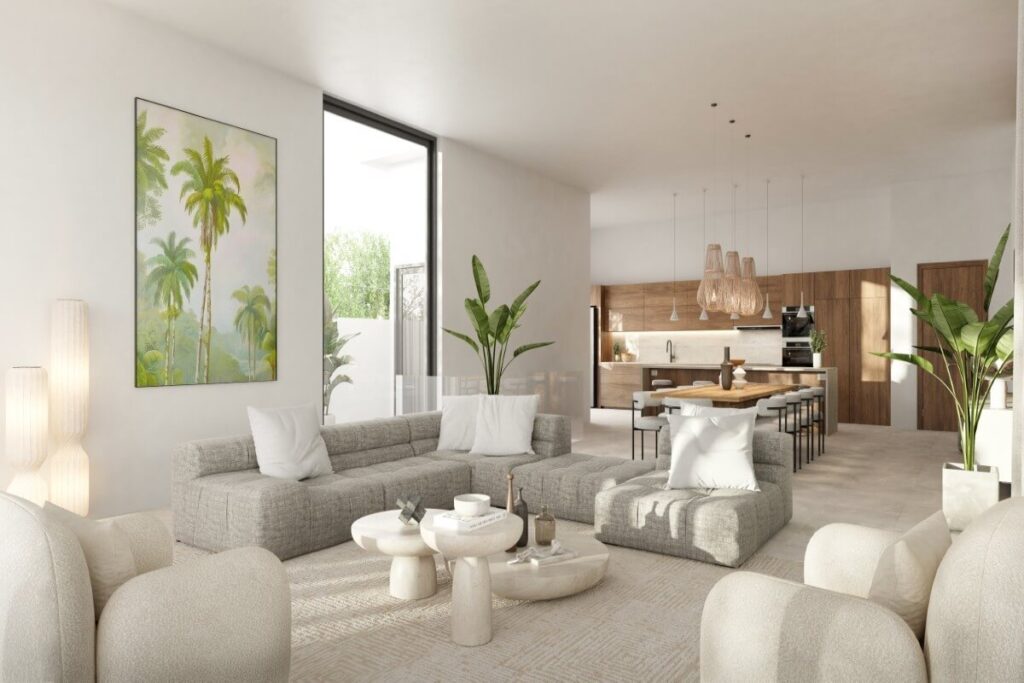 Each villa offers 310 sqm of internal space and a total built area of 550 sqm. The layout includes three ensuite bedrooms, two guest bathrooms, a private office, staff quarters, and a laundry room. The living and dining areas flow onto a large covered terrace, creating a seamless connection between indoor and outdoor spaces. Buyers have the option to add a 65 sqm multipurpose area suitable for a home gym, spa, or media room.