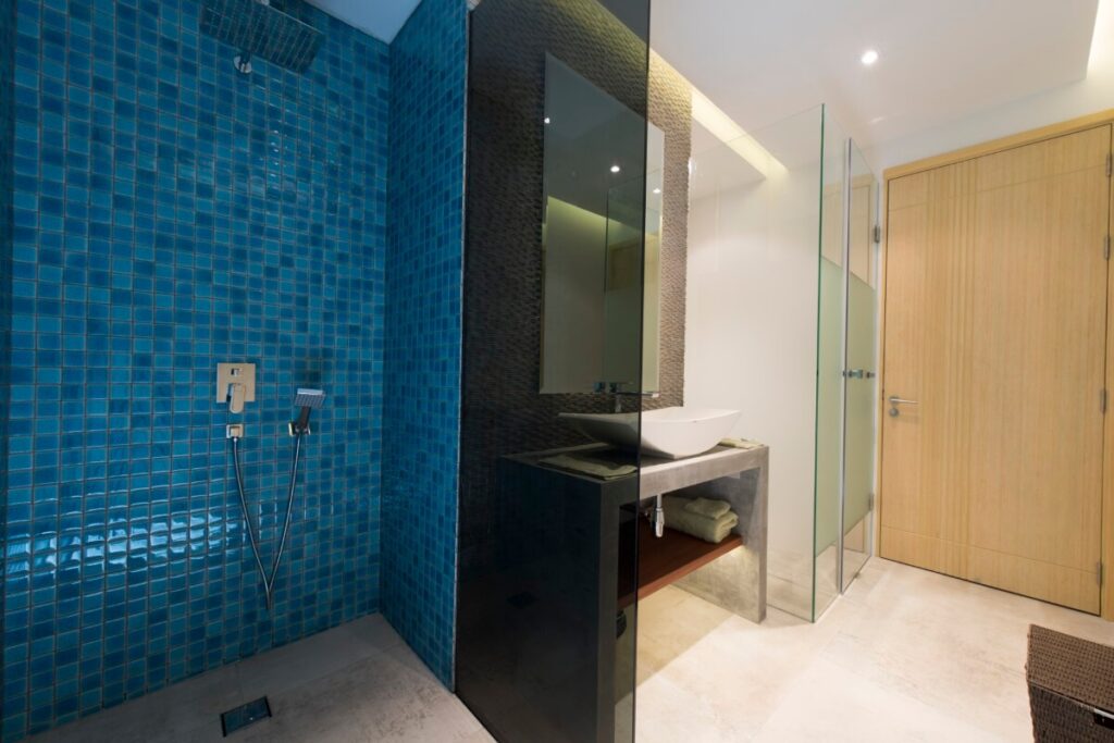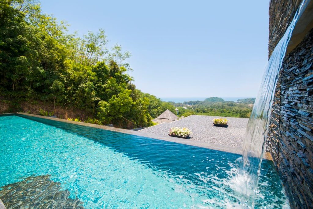 The outdoor living space measures approximately 60 sqm and incorporates the infinity-edge swimming pool with an integrated jacuzzi and waterfall feature, as well as an outdoor shower. The elevated hillside position allows open views across Layan and the sea while maintaining a private, self-contained environment.
