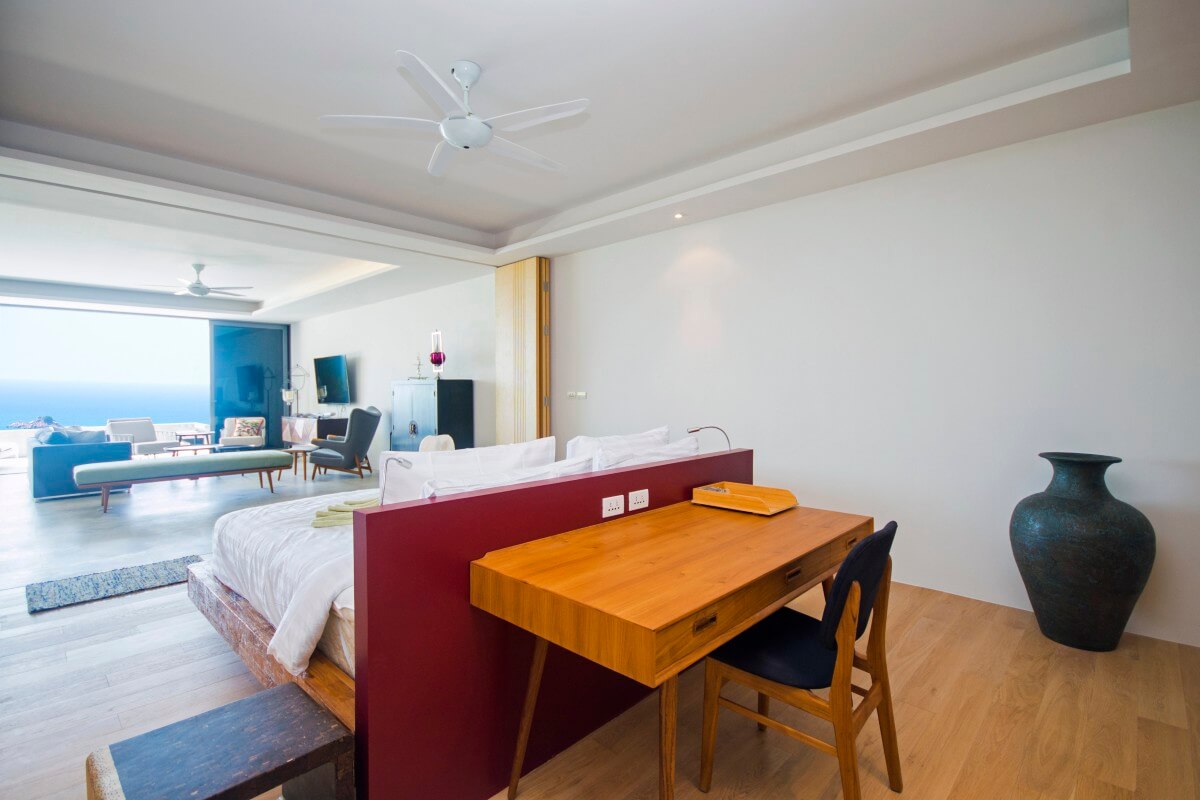 The residence is fully furnished and positioned on a hillside within a low-density gated project. The layout is organised around a full-width pool terrace that connects directly into the open-plan living, dining, and kitchen area. Accordion-style folding glass walls span the entire width of the living space and can be fully opened, creating a seamless connection between the pool, interior living areas, and the surrounding sea views.