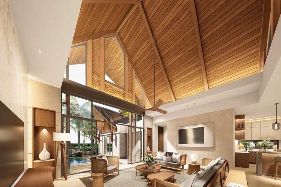 The villas are arranged in a square configuration, with the master bedroom extending in an L-shape around the swimming pool to create a direct visual and physical connection to the outdoor space. Two of the bedrooms provide direct access to the pool in addition to their internal access, while the remaining bedroom is positioned toward the rear for added privacy. Vaulted ceilings enhance the sense of volume in the main living area and master suite, and natural wood finishes in wall panels and built-in furniture introduce warmth and texture.