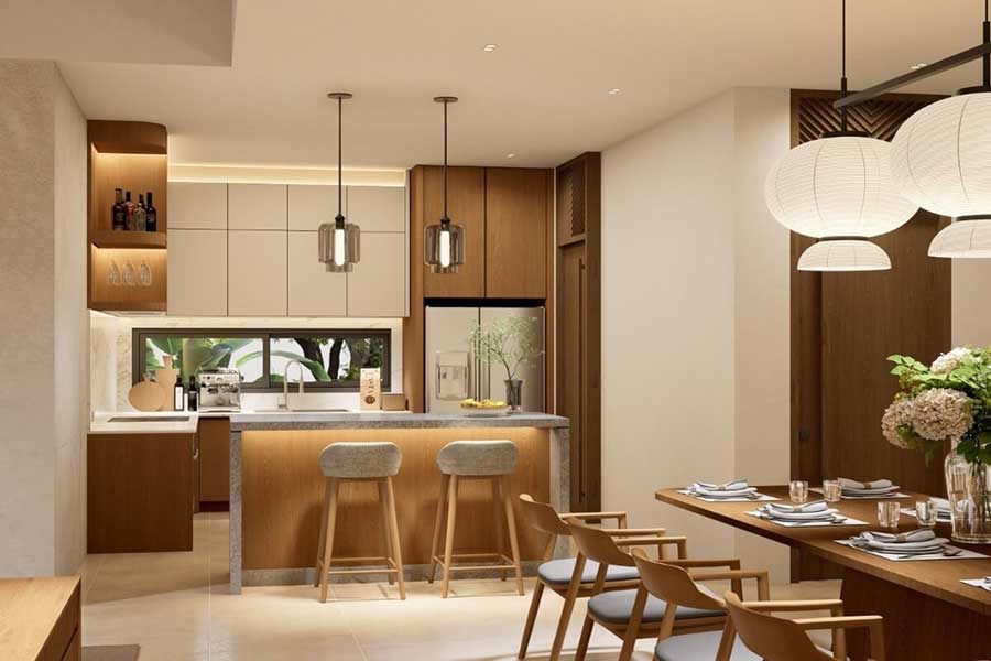The living, dining, and kitchen areas are designed in an open-plan layout facing the pool deck. Sliding doors open directly onto the outdoor terrace, integrating indoor and outdoor living. A separate laundry room and guest bathroom are included within the layout, supporting practical day-to-day use.