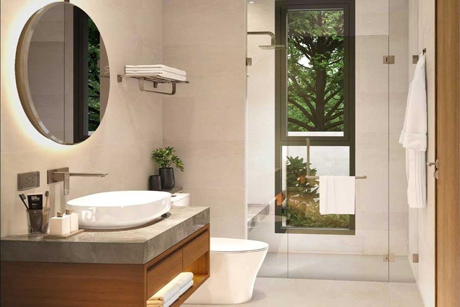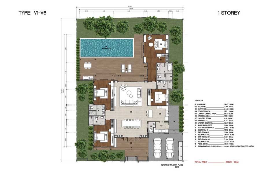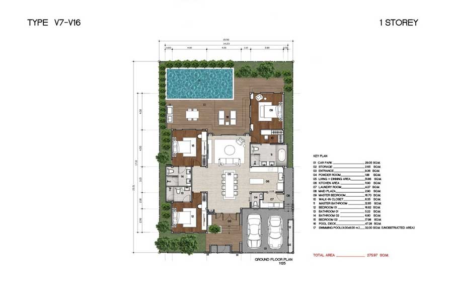 For the 3-bedroom layout, the private swimming pool measures 32 sqm, complemented by a 47.28 sqm pool deck that provides space for seating and outdoor entertaining. Plot sizes within the development vary, and each villa includes two covered parking spaces within a fully fenced boundary.