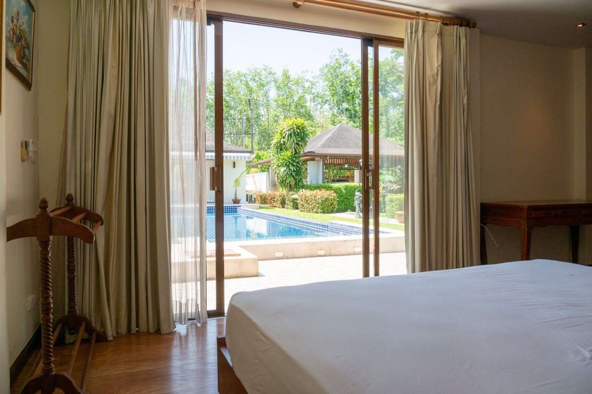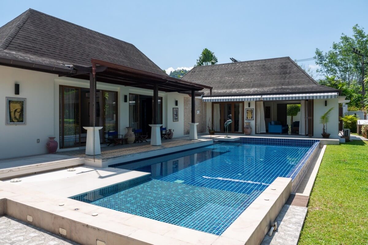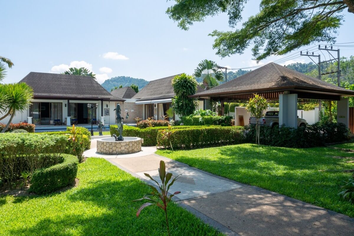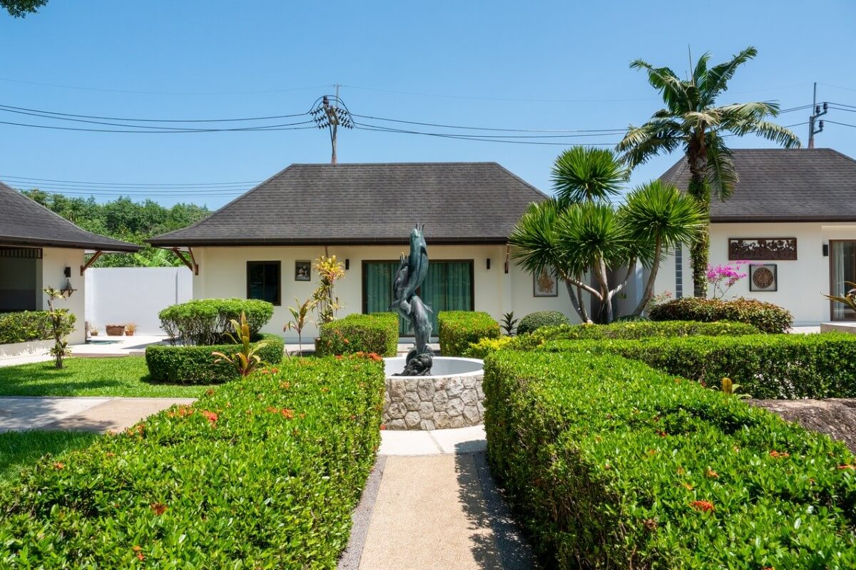 This expansive 4-bed garden pool villa in Pa Klok is set within a quiet residential area, offering 643 sqm of build area on a large 1,550 sqm land plot, with a pool running the full length of the property surrounded by mature tropical gardens.
