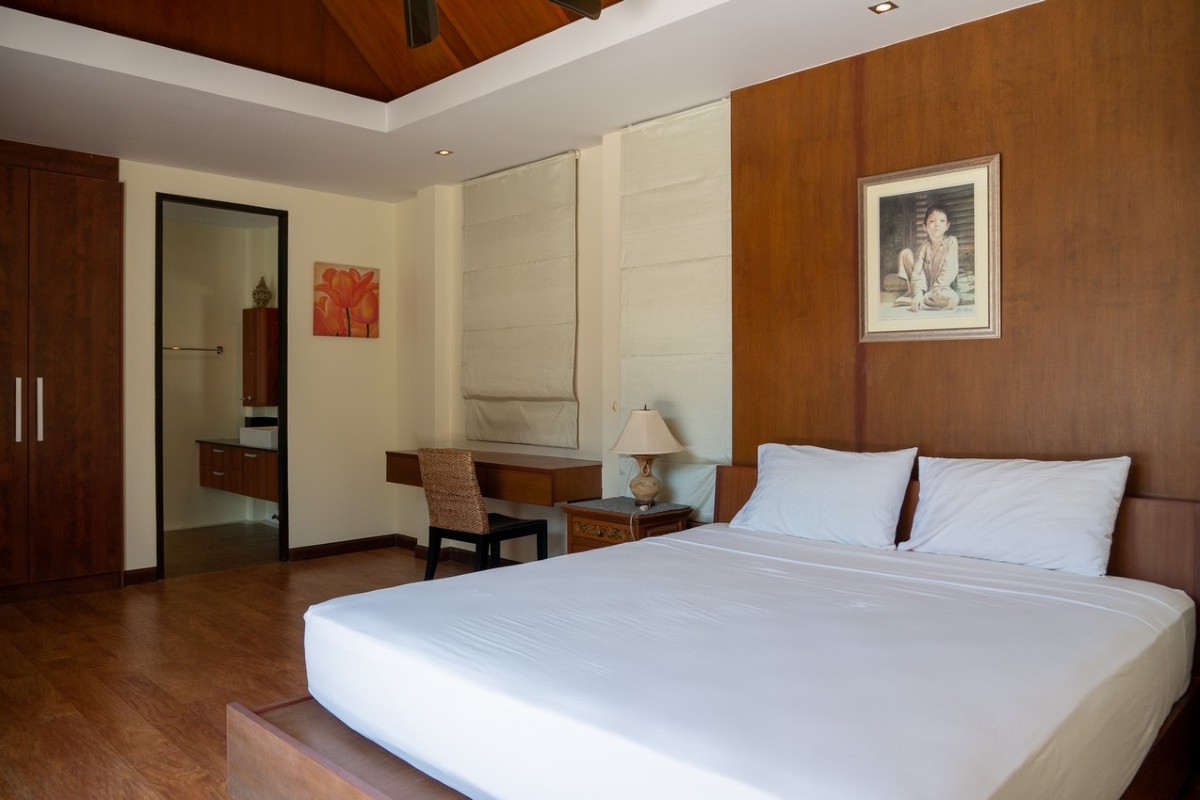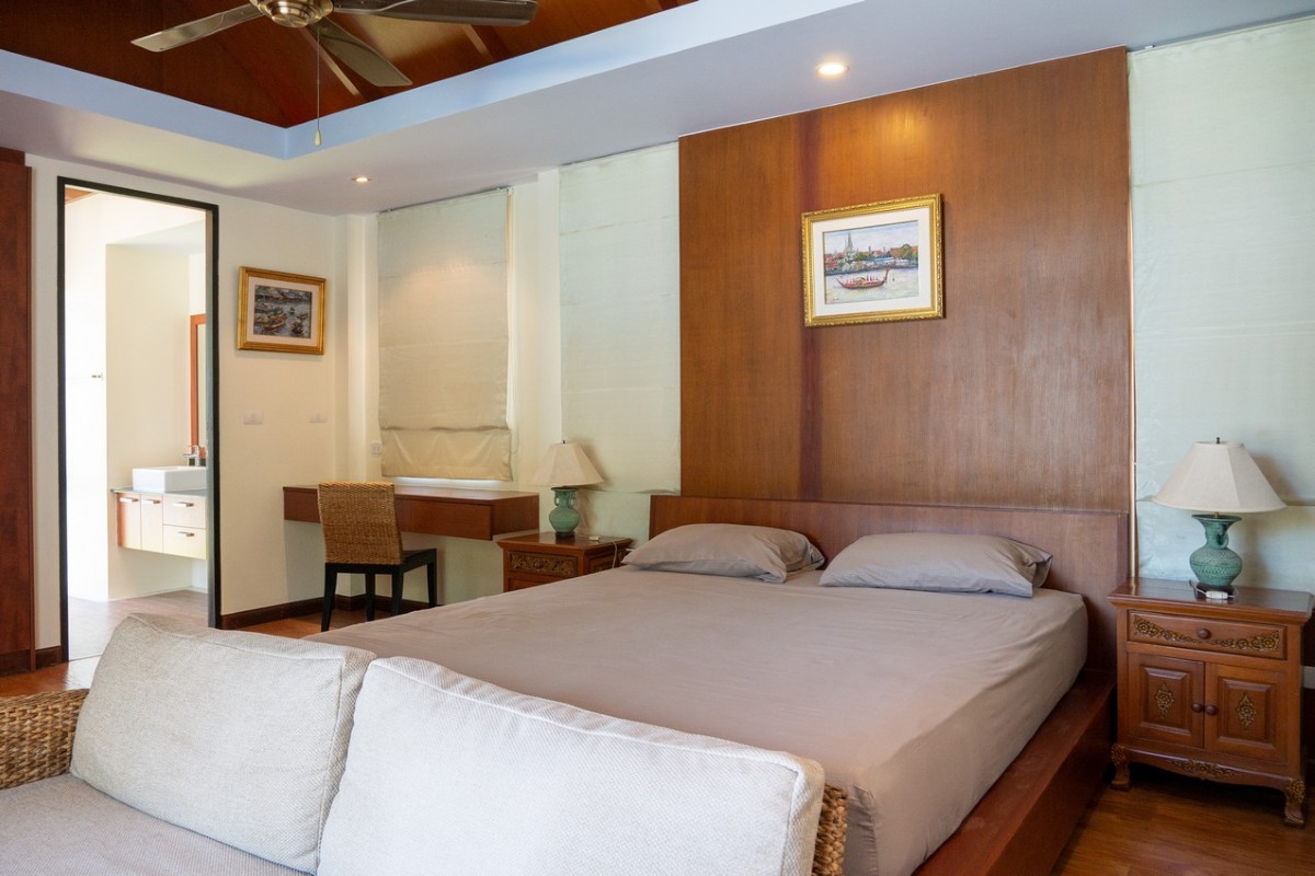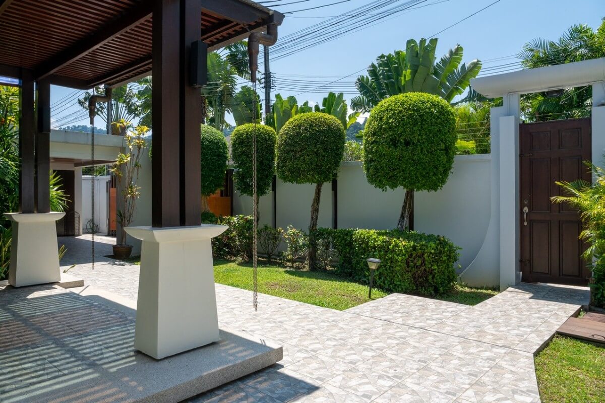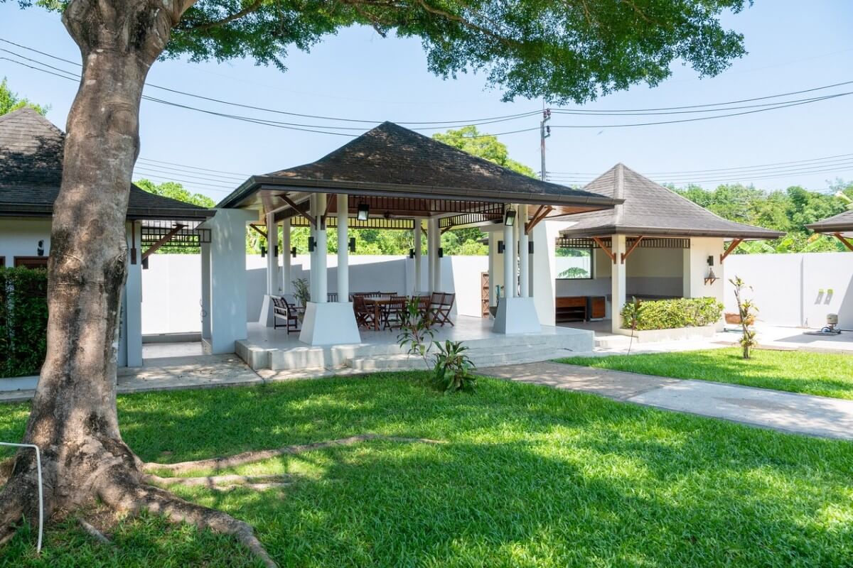 This expansive 4-bed garden pool villa in Pa Klok is set within a quiet residential area, offering 643 sqm of build area on a large 1,550 sqm land plot, with a pool running the full length of the property surrounded by mature tropical gardens.