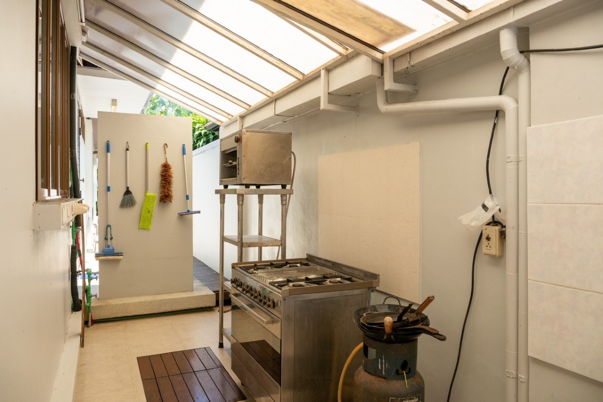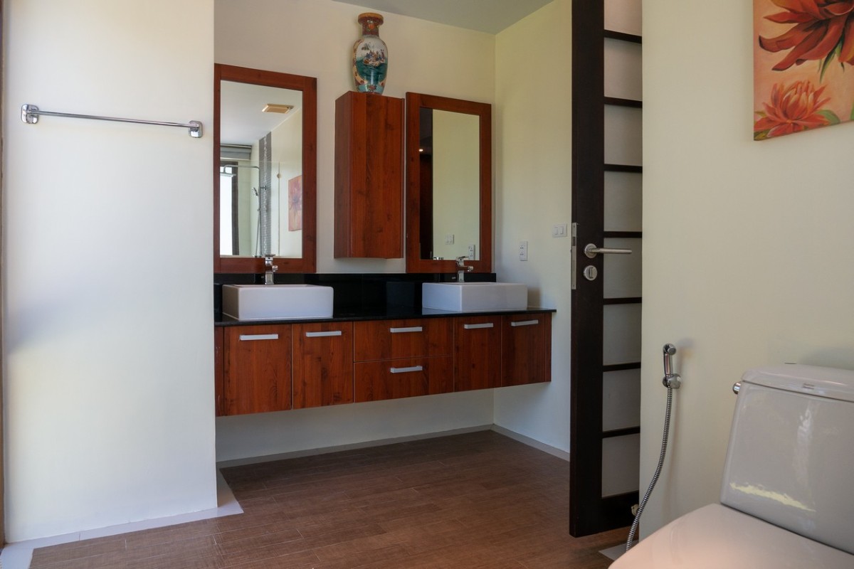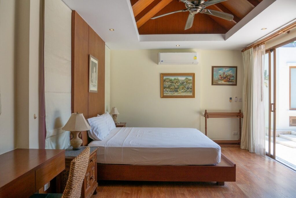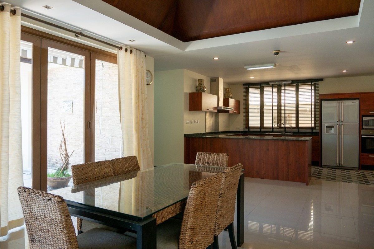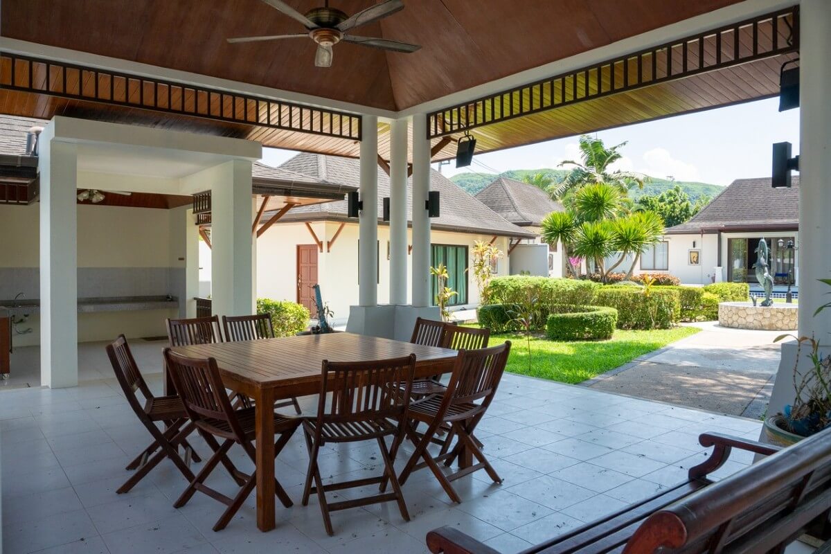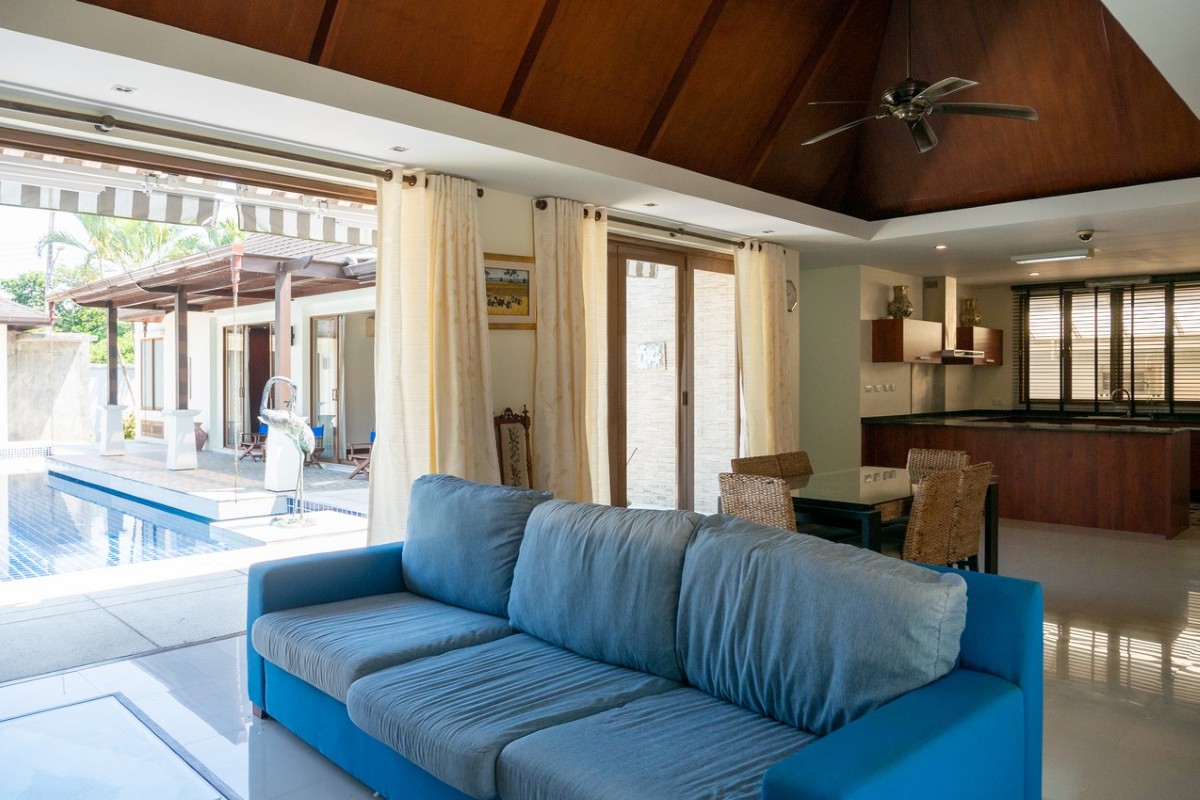 Built in 2009 and well maintained, the villa combines space, craftsmanship, and privacy in one of Phuket’s most peaceful up-and-coming neighbourhoods. The open-plan living area features vaulted redwood ceilings, hardwood floors, and full-length glass doors opening directly onto the pool terrace.