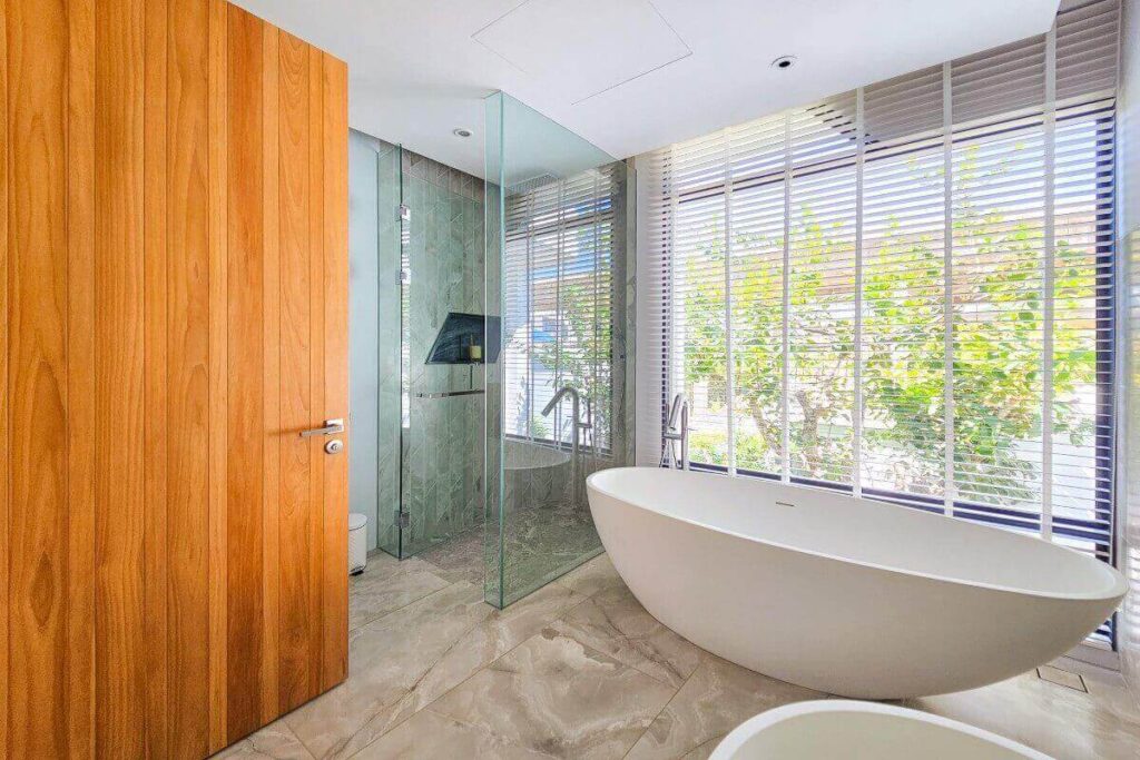 The 582 sqm villa sits on a 914 sqm plot and features a 12 x 5 metre swimming pool framed by lush landscaping and wide terraces. Interiors are defined by open spaces, tall ceilings, and natural materials, creating an elegant blend of Balinese architecture and contemporary comfort.