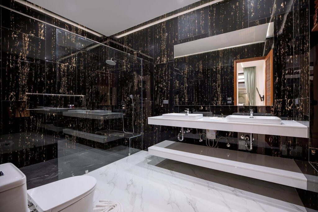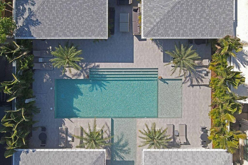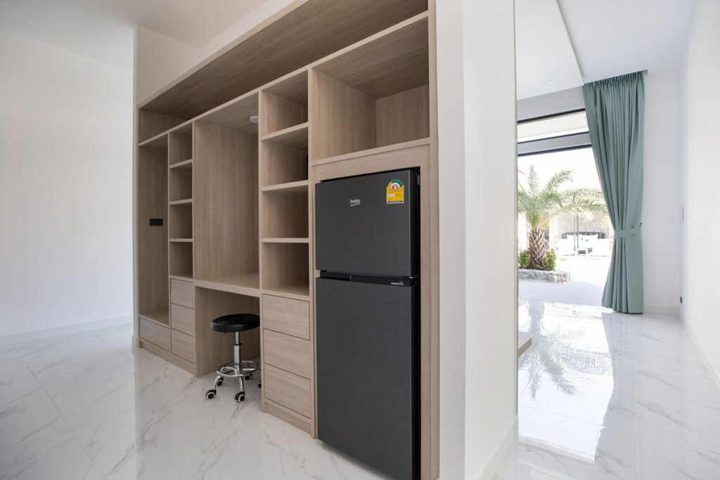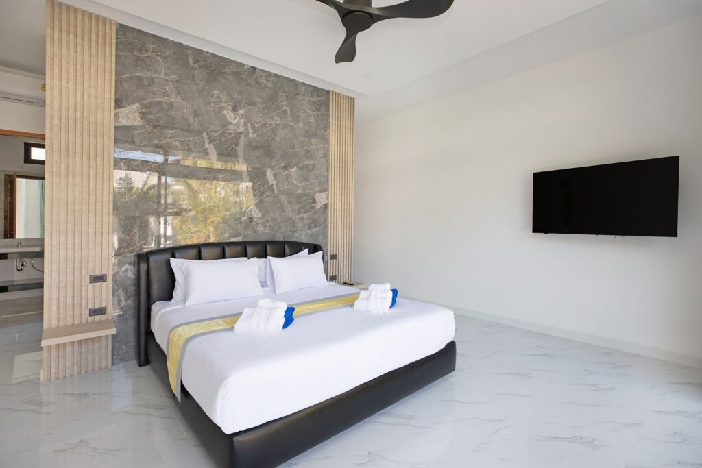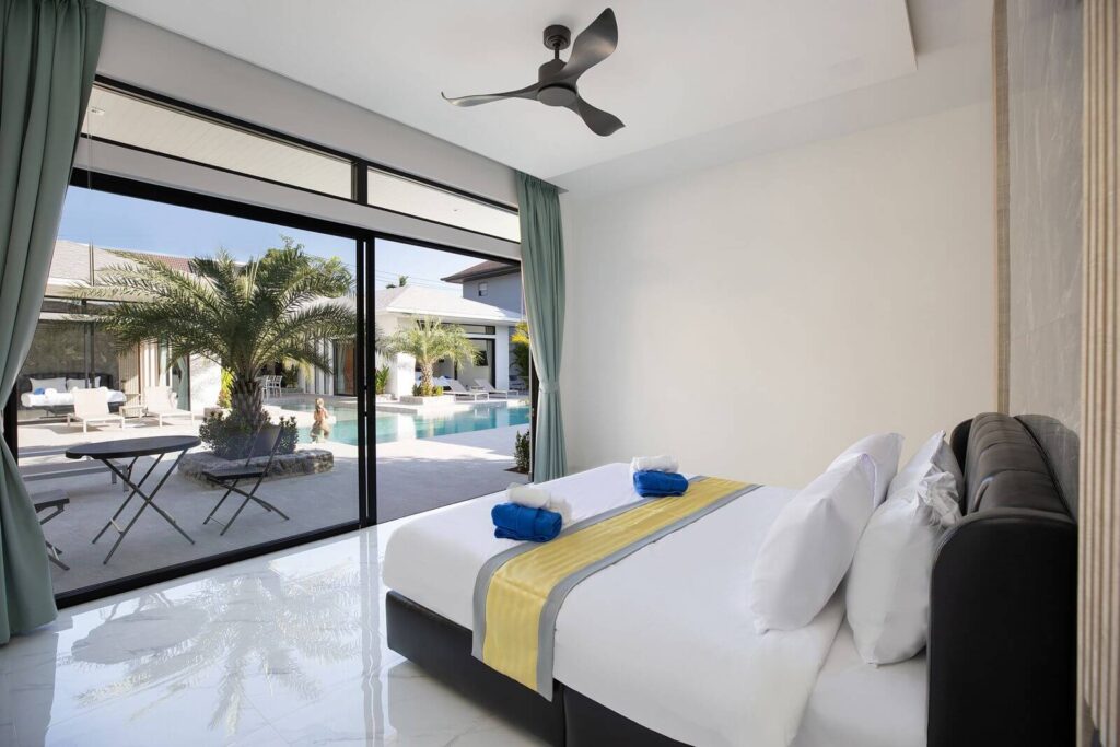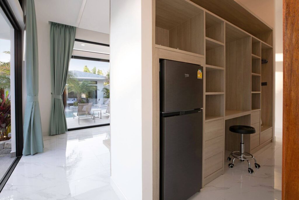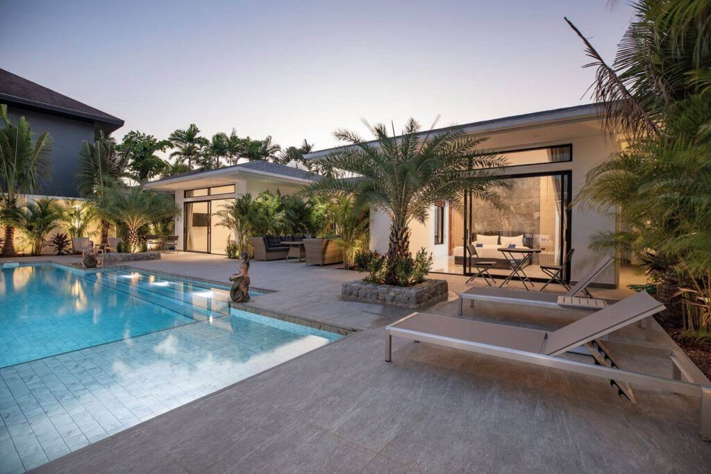 Two of the bedrooms are positioned within the main building, separated from the living area by a hallway, while two additional bedrooms are located across the pool in their own pavilion. Each bedroom includes an ensuite bathroom, walk-in closet, and personal refrigerator.