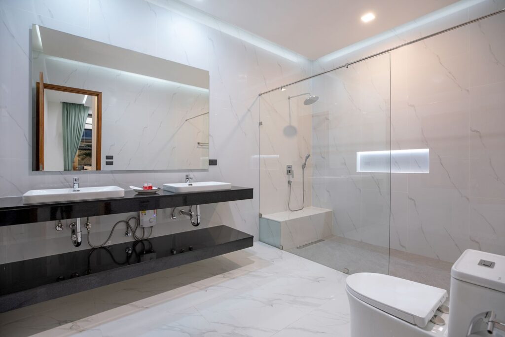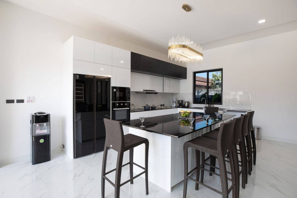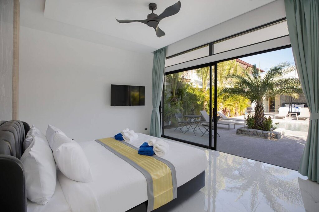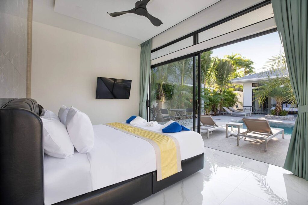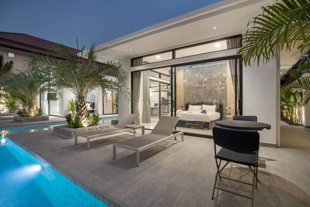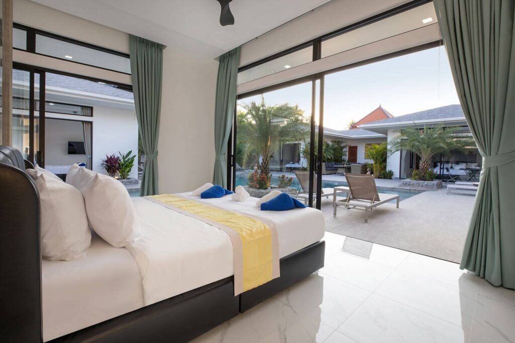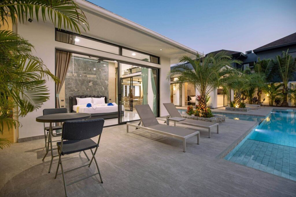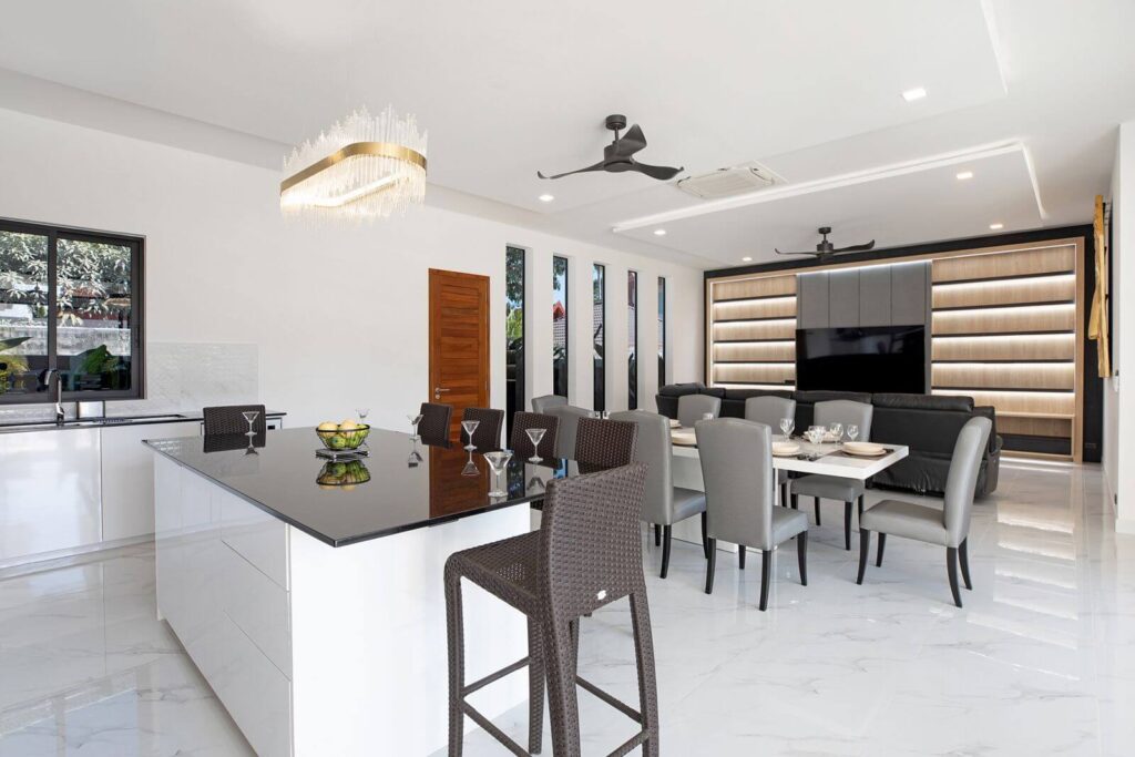 Built in a contemporary single-level design, the villa is arranged around a central saltwater swimming pool, with all four bedrooms, living, dining, and kitchen areas opening directly to the pool terrace through sliding glass doors. The pool includes a shallow area that doubles as a children’s pool, creating a family-friendly layout while maintaining a sense of privacy.