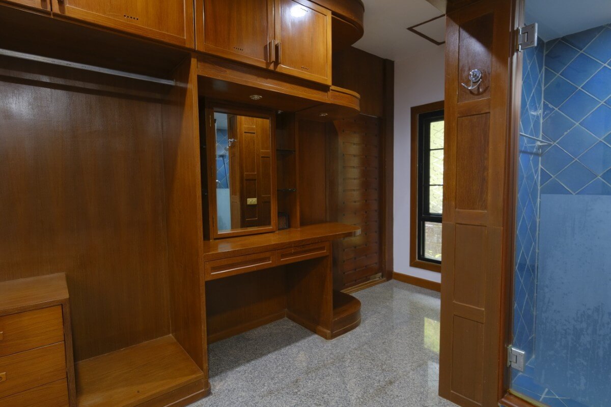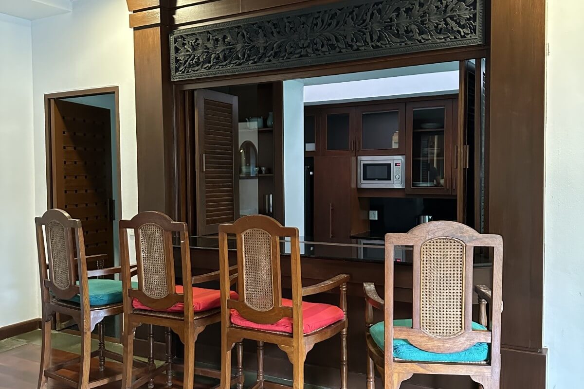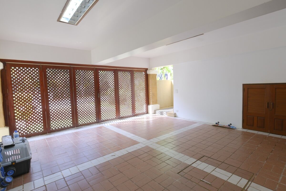 The gently sloping 1,000 sqm land plot gives the garden a layered feel, with mature tropical planting providing strong natural privacy throughout the property. The swimming pool sits at the centre of the layout, visually linking the pavilions. Outdoor features include a sala overlooking the garden and a roofed bar facing the pool, supporting relaxed outdoor living and entertaining. Secure parking is available for two cars within the plot.