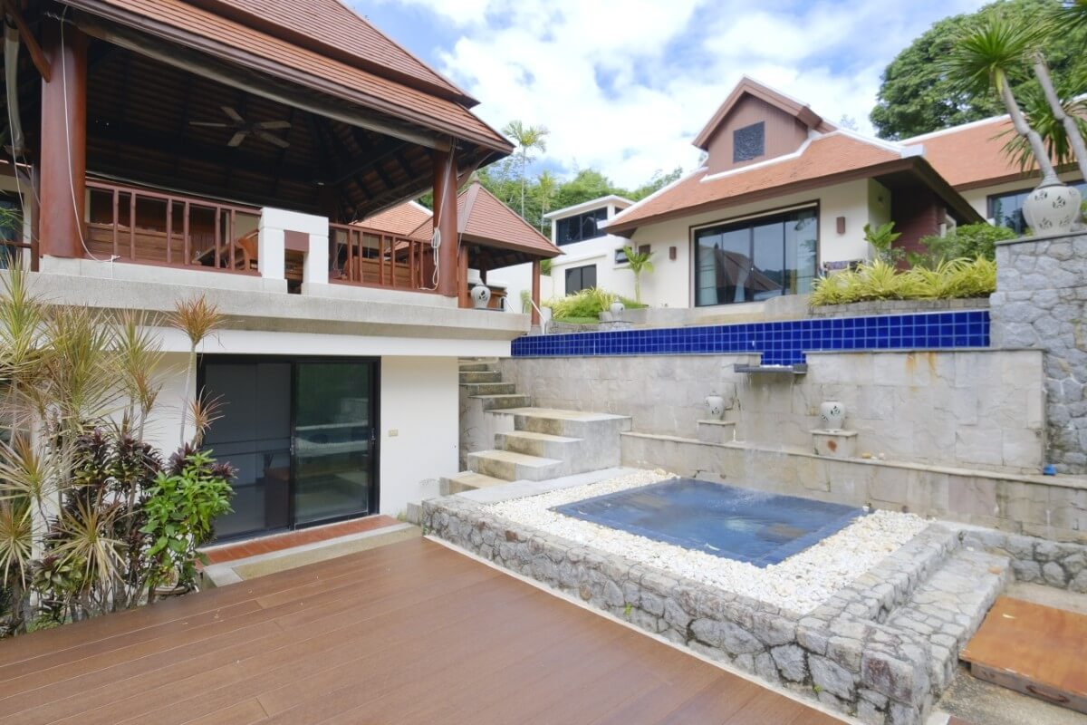 For sale fully furnished within a mature gated community close to Nai Harn Beach in Phuket, this Thai-Balinese style pool villa offers a 450 sqm build area spread over three pavilions.