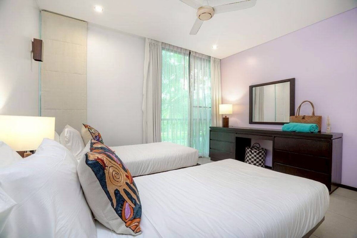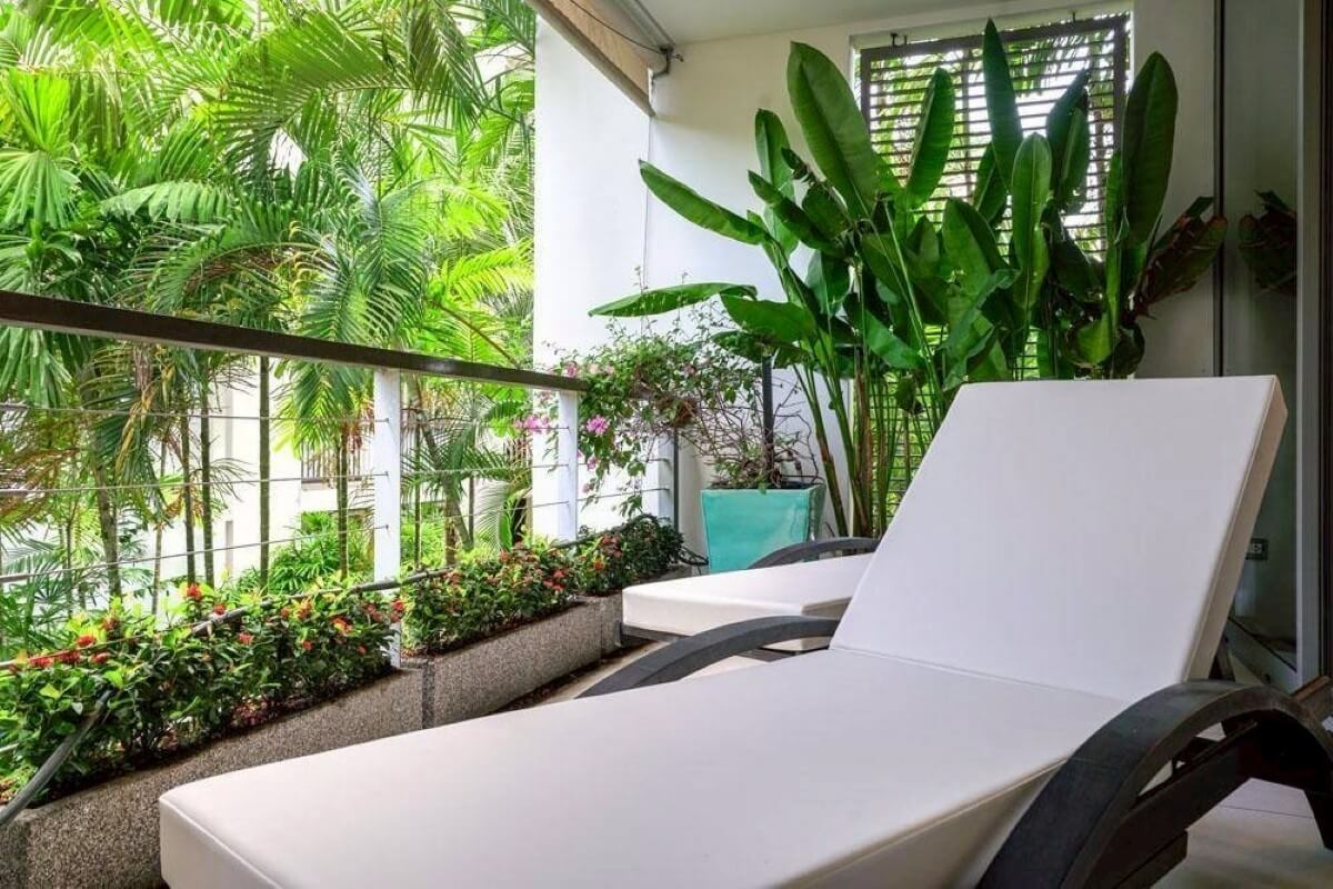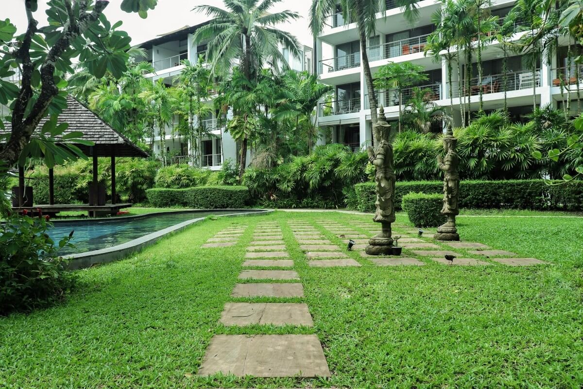 The development sits on manicured grounds with pathways running through tropical gardens, creating a calm, walkable environment. Facilities include a 25-metre sports pool, a separate free-form family pool with children’s non-slip areas, an outdoor Jacuzzi, sauna, and fully equipped gym. Larger unit options within the development include 2-bedroom residences with private gardens of up to 300 sqm and 2-bedroom penthouses of up to 280 sqm with private pools.