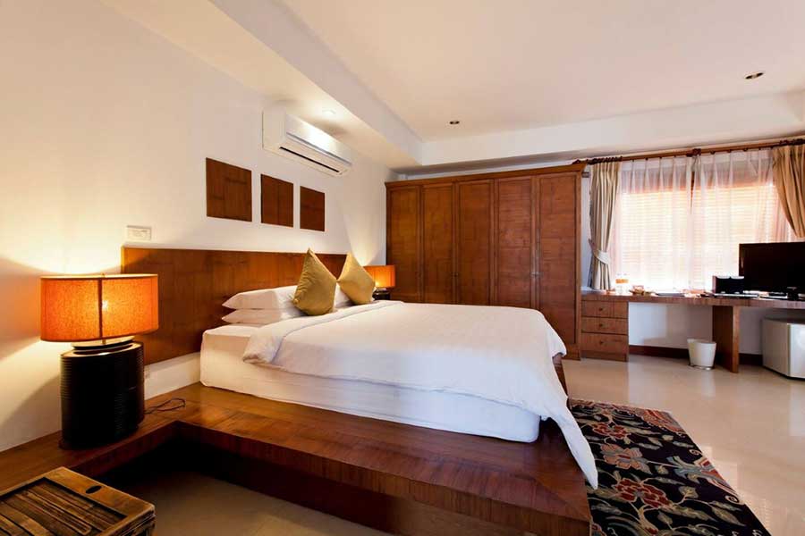 Refurbished with Jim Thompson silk accents and hand-carved furnishings, the villa includes eight en suite bedrooms spread across separate wings for privacy. Interiors are arranged around an open-plan living and dining area with direct views of the pool and gardens.