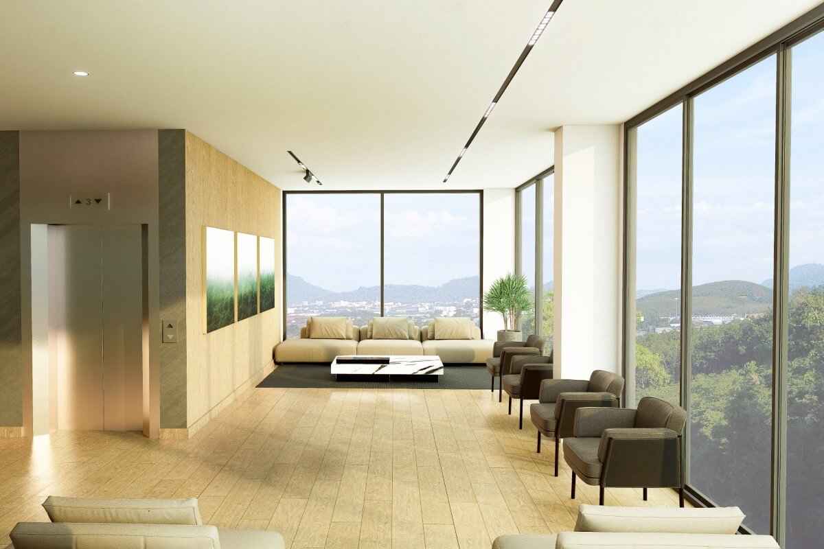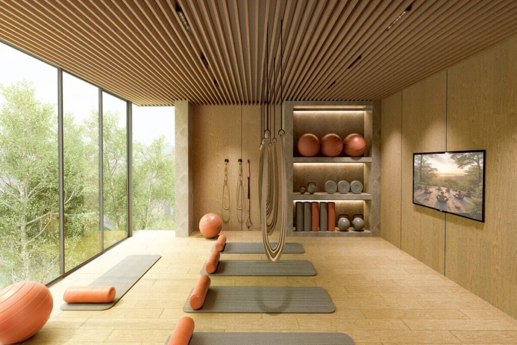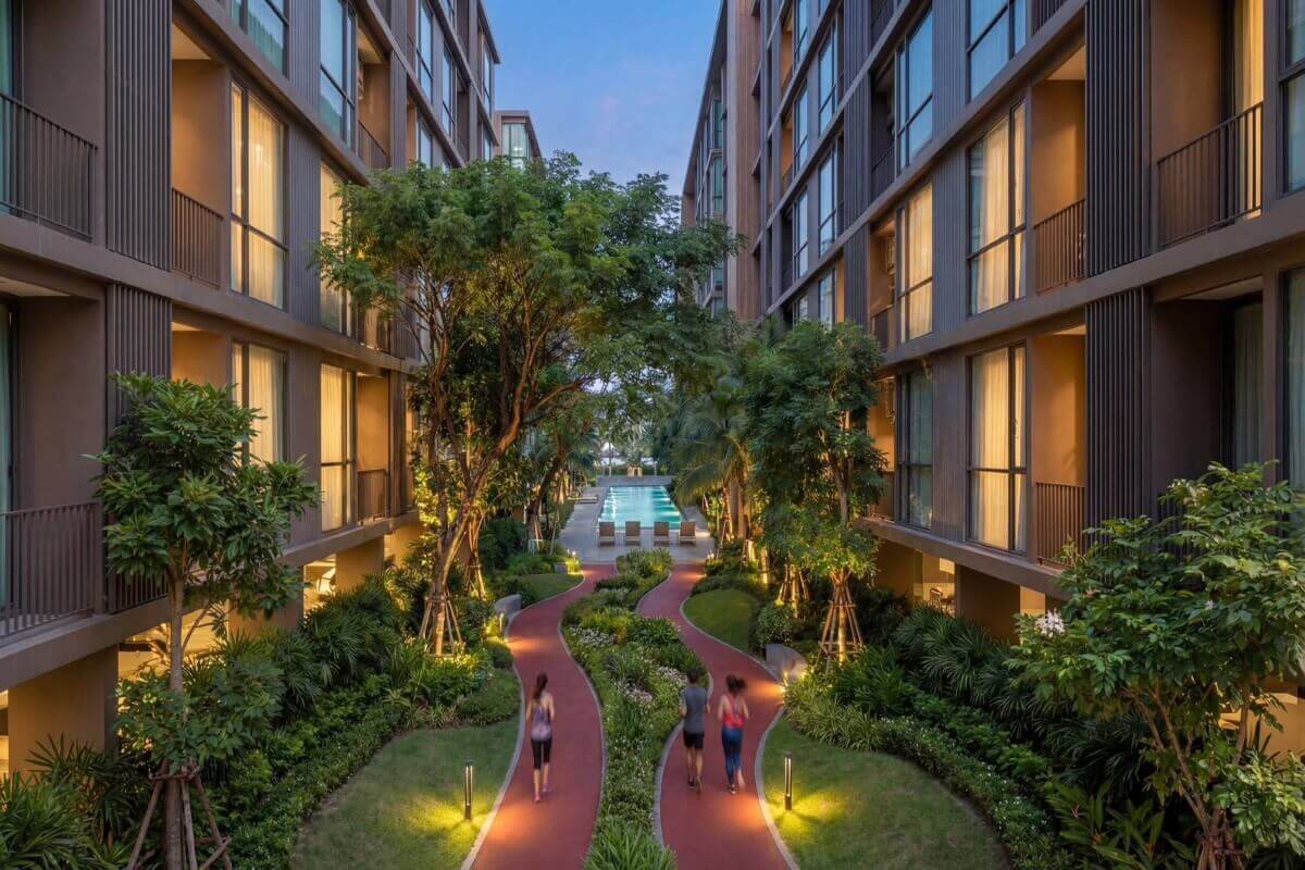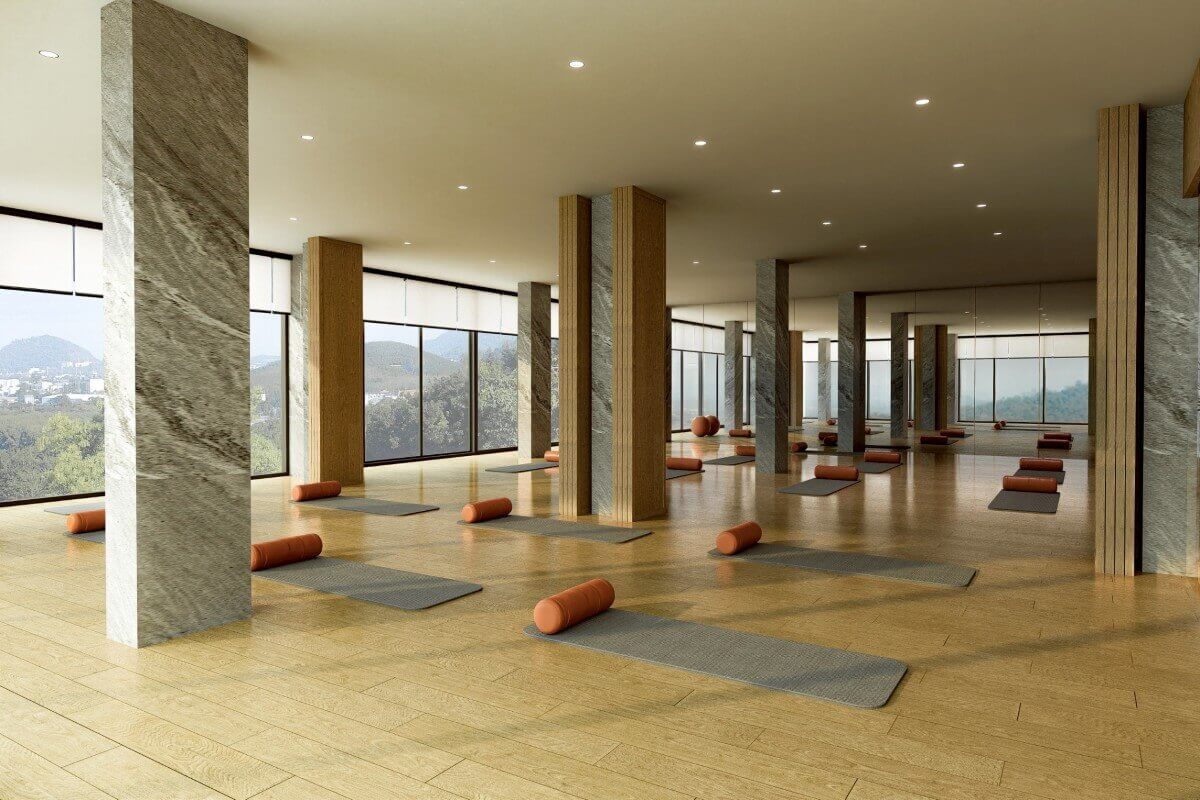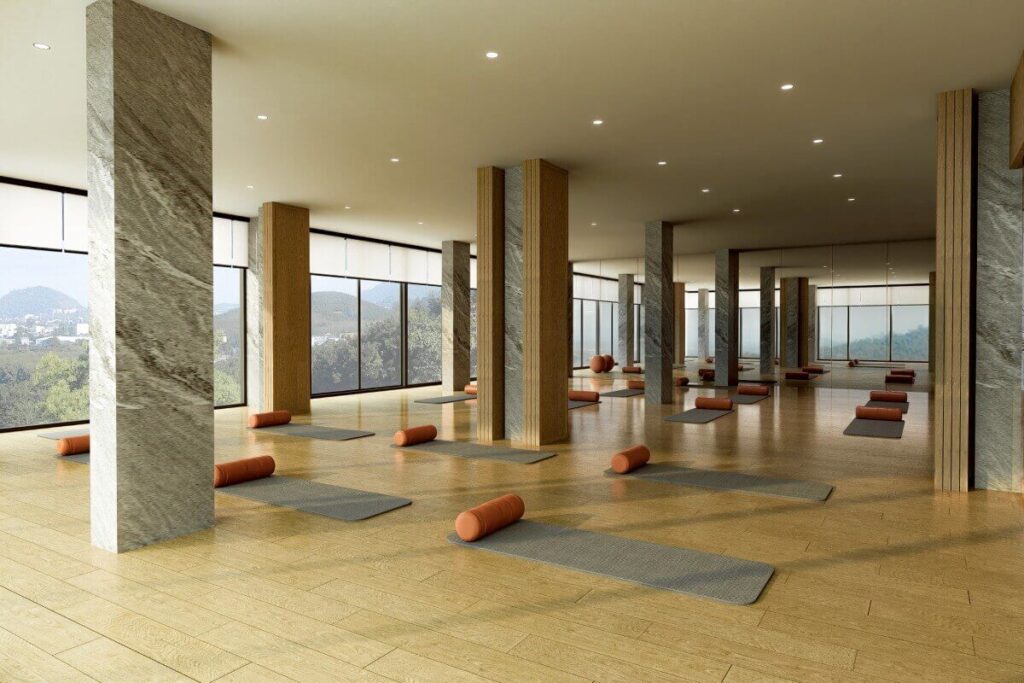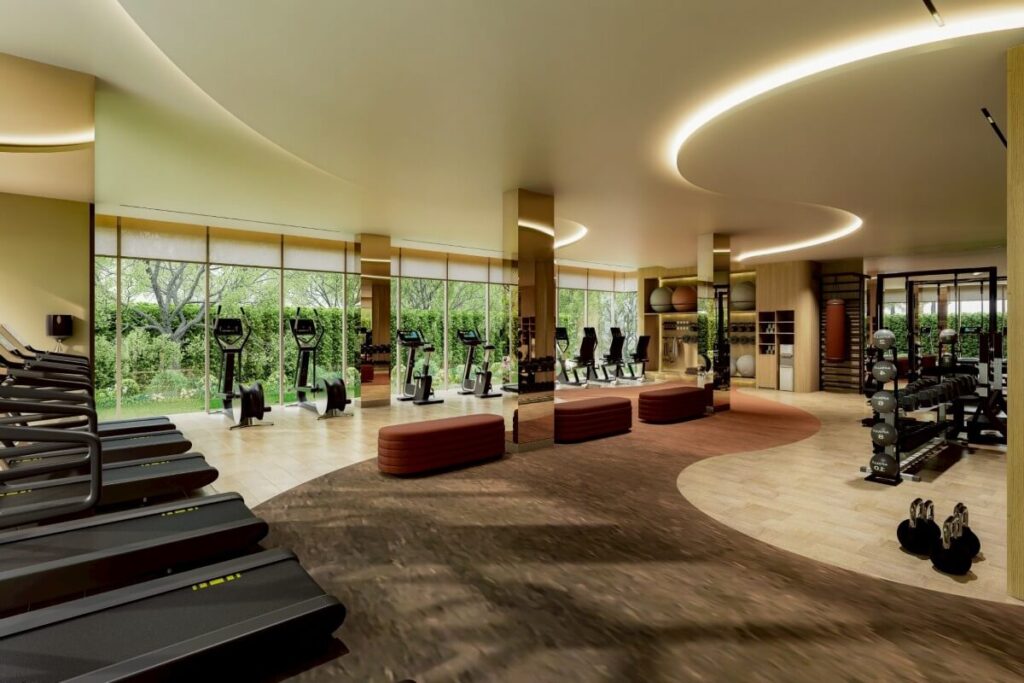 The facilities are built around training and recovery. Three swimming pools include a half-Olympic pool designed specifically for lap swimming and athletic use. A sloped jogging track of around 250 metres runs through the project grounds. The 3-storey clubhouse houses a fitness centre, co-working areas, and function rooms suitable for private classes, alongside a hotel-style reception serving both residents and long-stay occupants. Landscaped gardens and quiet seating areas are integrated throughout for relaxation between sessions.