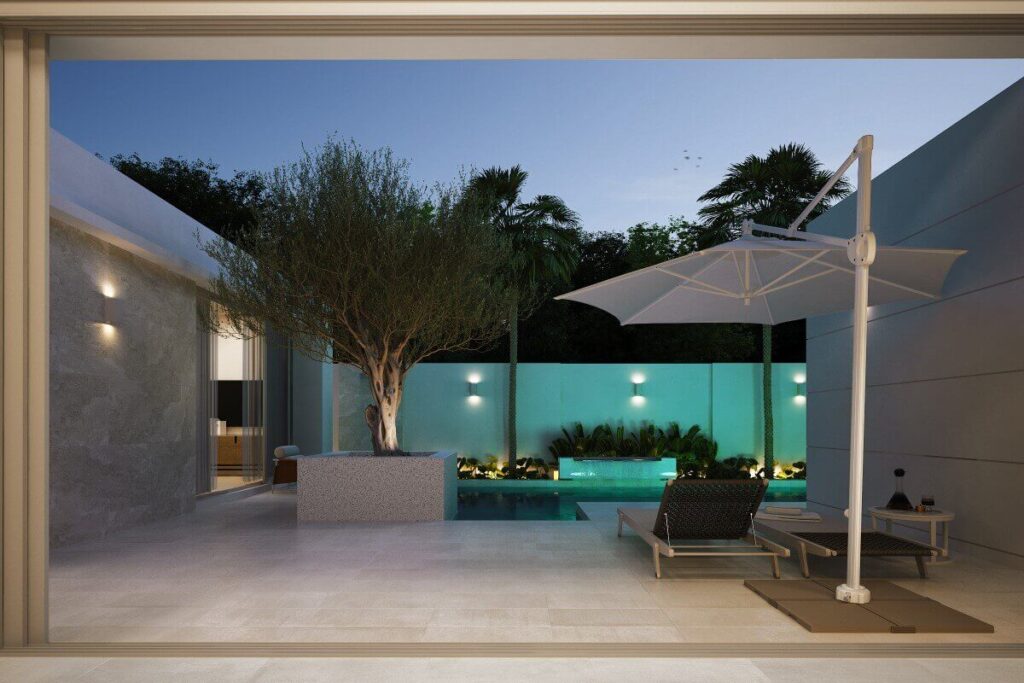 Outdoor space is fully enclosed by high perimeter walls, allowing the courtyard and pool to function as a private extension of the interior living area. The swimming pool measures approximately 32 sqm and anchors the outdoor layout, with an optional jacuzzi available. Despite the compact footprint, the plot is efficiently utilised, maintaining a balanced relationship between indoor and outdoor areas.