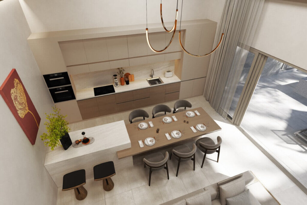 Indoor living space measures approximately 139 sqm and is centred around an open-plan living, dining, and kitchen area that opens directly onto the pool terrace. Vaulted ceilings in the main living space increase the sense of volume, while the interior palette is kept intentionally restrained, using soft sandstone tones to create a calm and cohesive atmosphere.