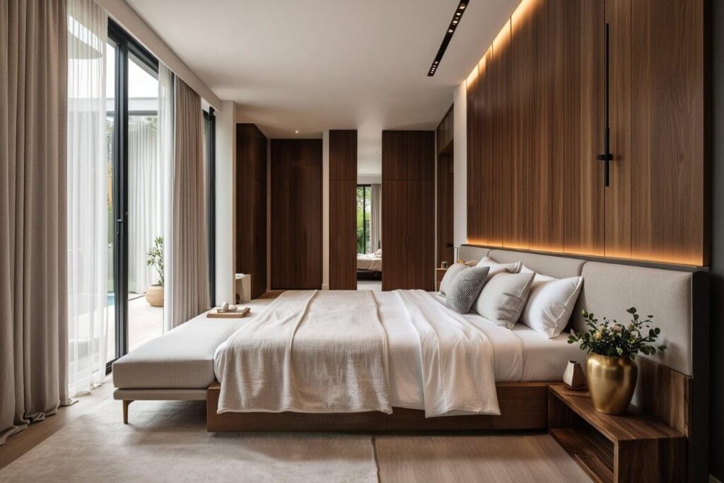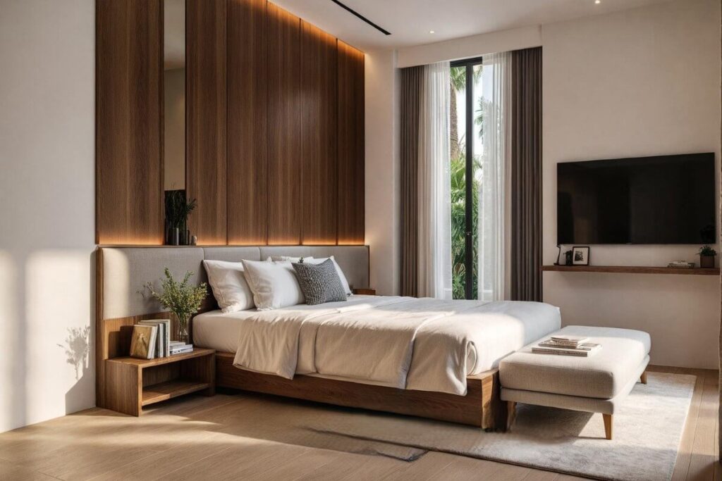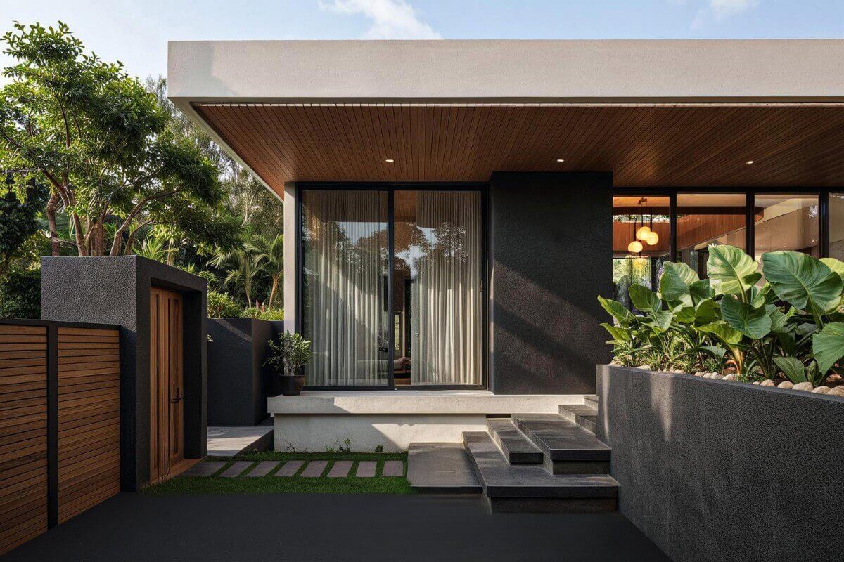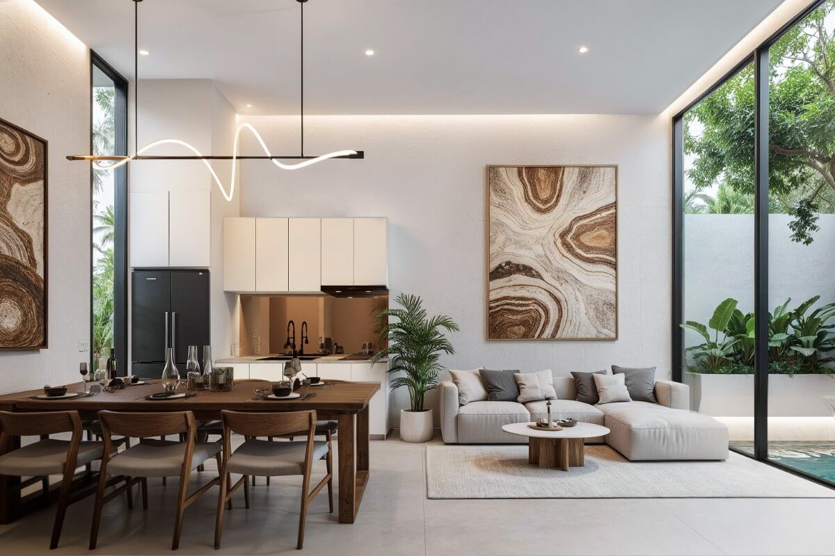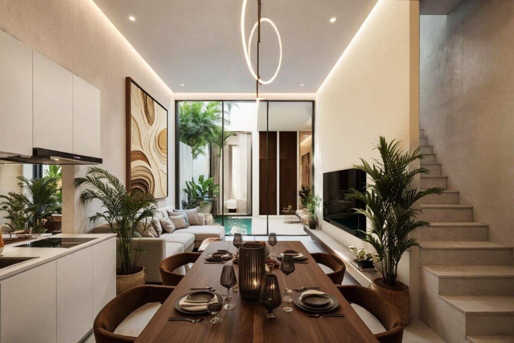The pool villas are single-storey with an L-shaped layout wrapping around the pool. Built-up areas range from 210 to 340 sqm on plots of 262 to 560 sqm, with parking for two small vehicles or one large SUV. Each villa features a 26.7 sqm private pool, with the master bedroom enjoying direct pool access. The open-plan living, dining, and kitchen area also opens to the pool, with one ensuite bedroom on one side and a third bedroom positioned next to the master, sharing a bathroom with the living area. The development totals 15 villas and 48 townhomes.
