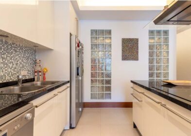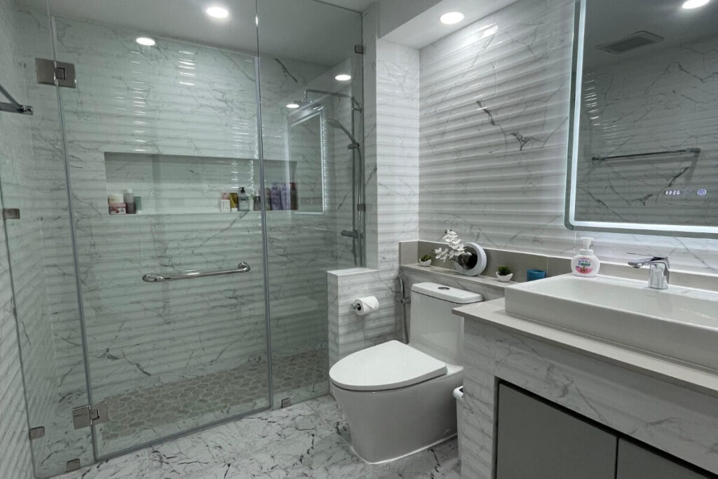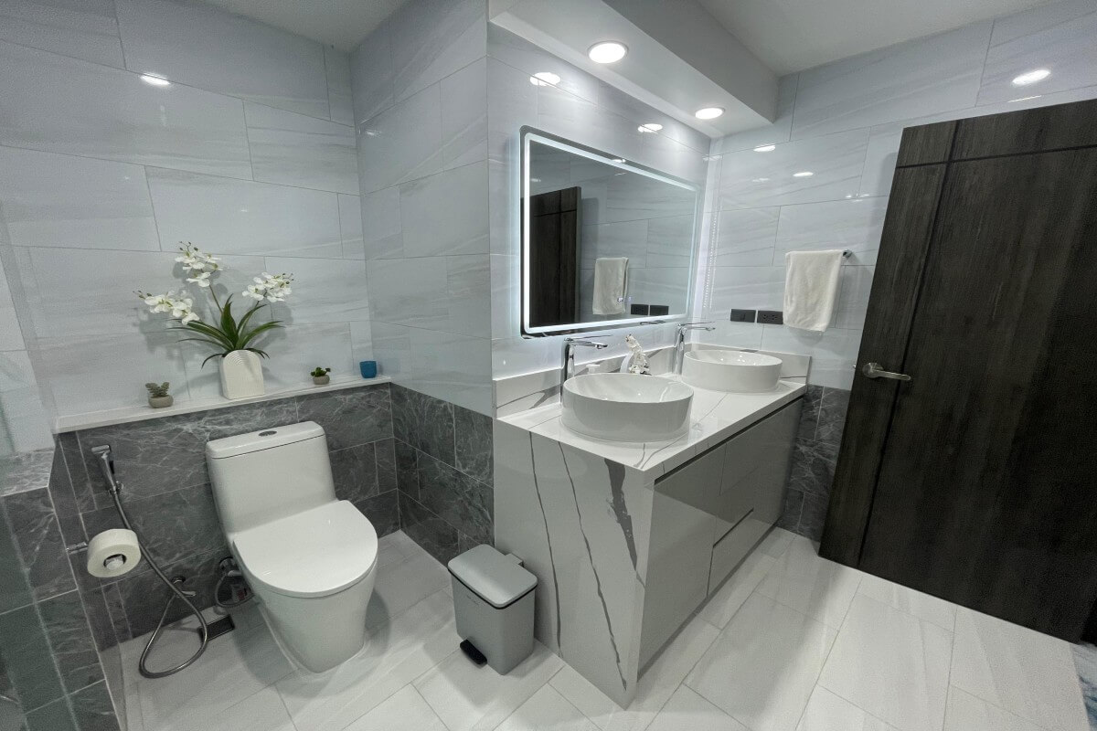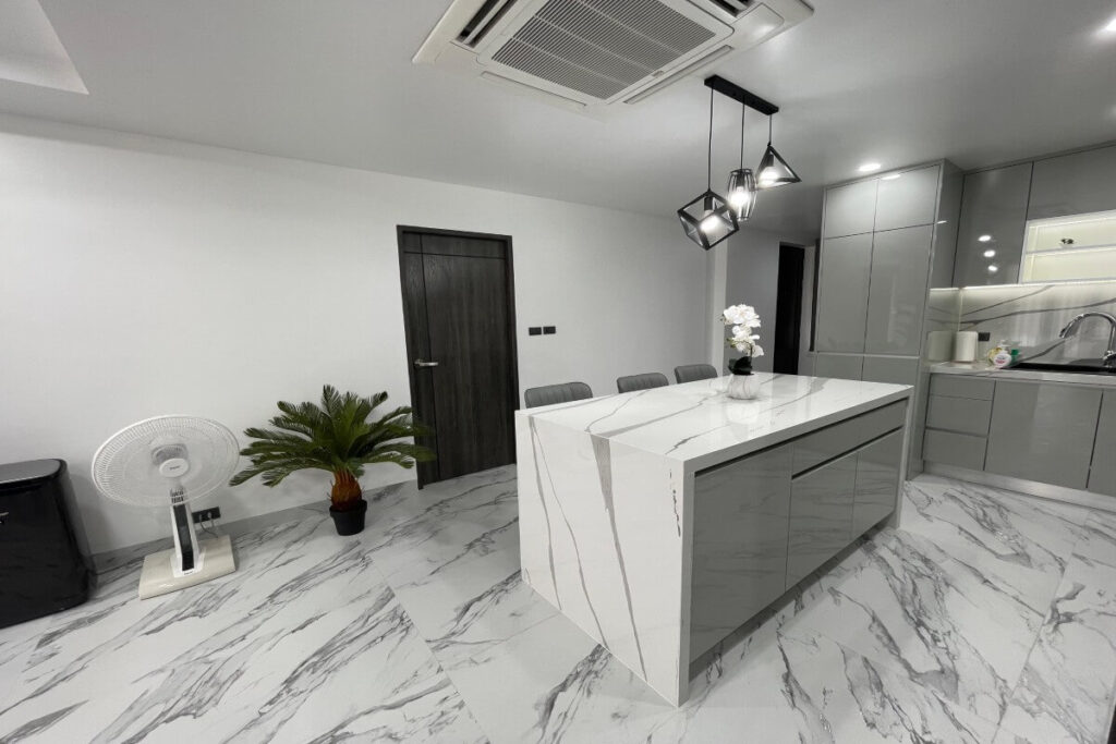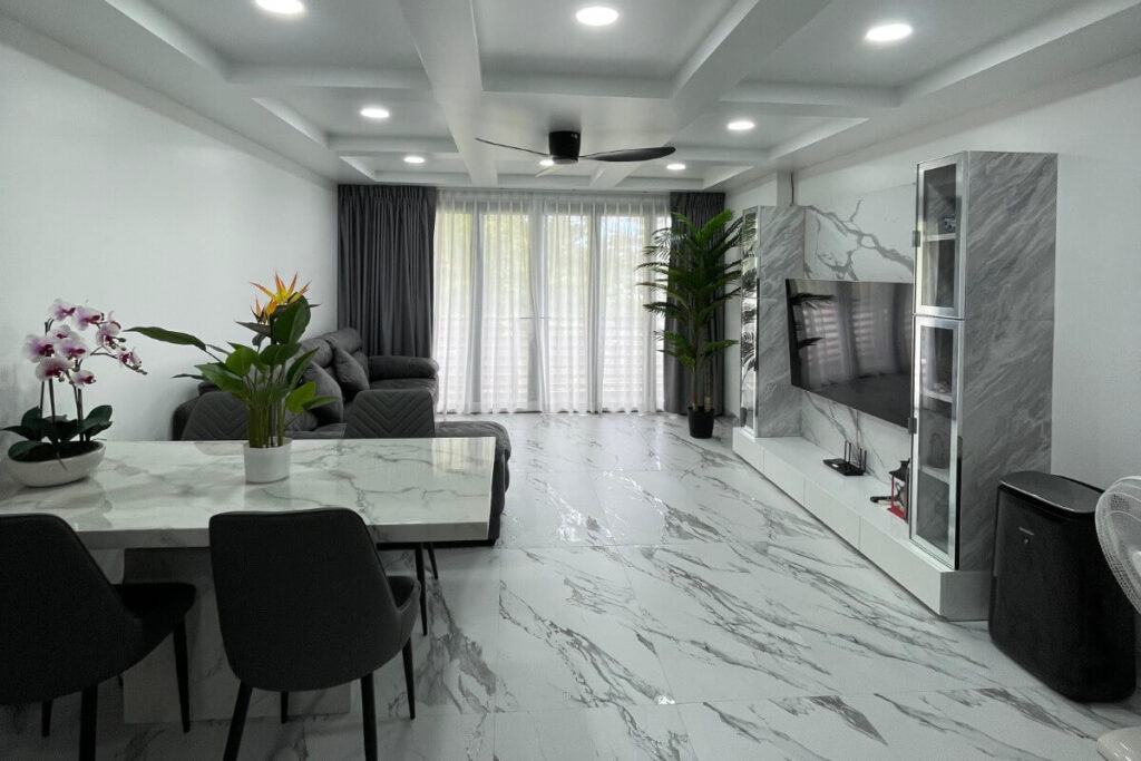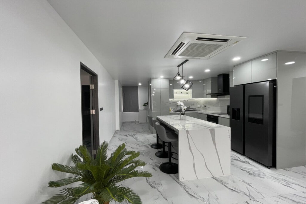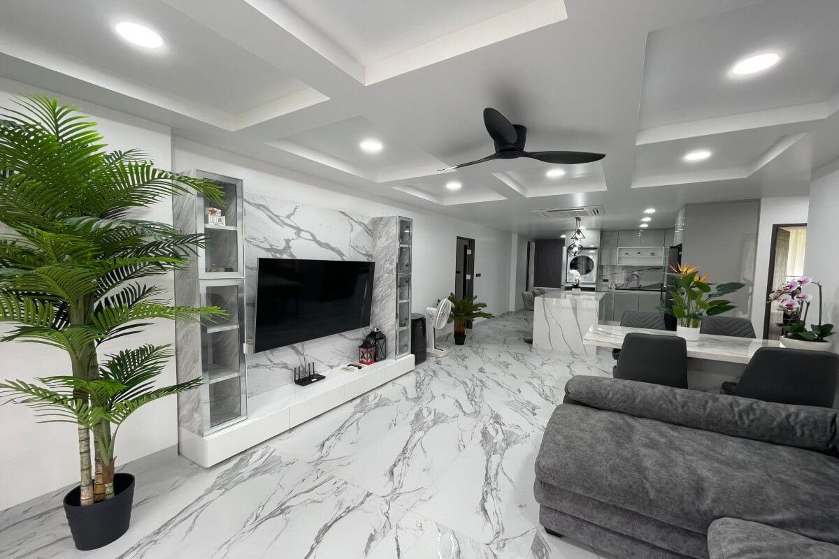 Large-format porcelain tiles run through the main living areas and bedrooms, and the bathrooms have been fully updated with modern layouts and fixtures. The kitchen features Italian-designed cabinetry, porcelain countertops with waterfall edges, a full-height backsplash, and premium appliances. Wall-mounted Samsung TVs are installed across the living spaces, and all three bedrooms are furnished with king-size beds and upgraded fittings.