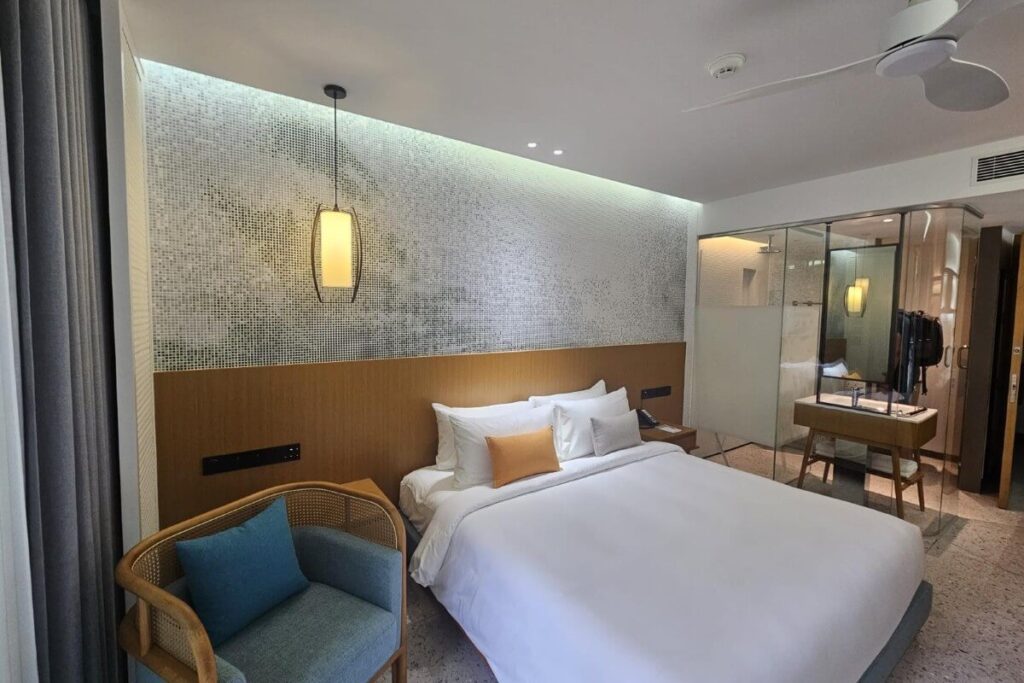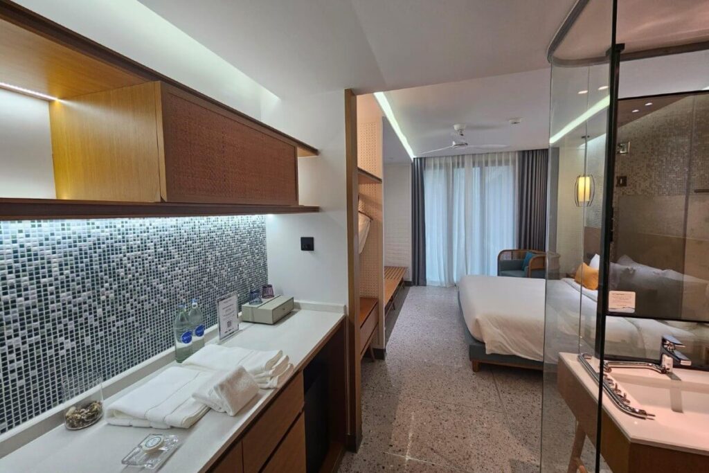 Located on the top floor of the building, the condo enjoys elevated views across the landscaped grounds and artificial river within the development. The unit follows a compact hotel-style layout across a built-up area of 28 sqm. Upon entry, built-in shelving with cabinets and a compact fridge is positioned to the left, with the bathroom located on the right. The main sleeping area is arranged with a king-size bed and TV, leading directly out to a private balcony via sliding doors.