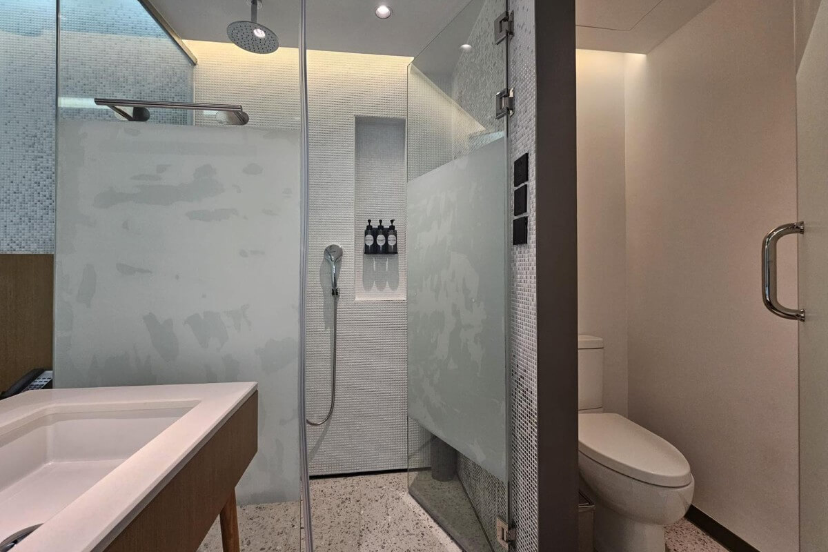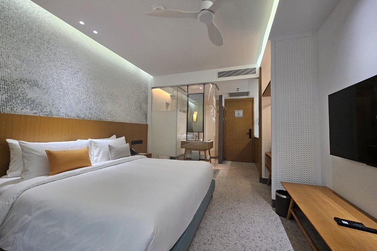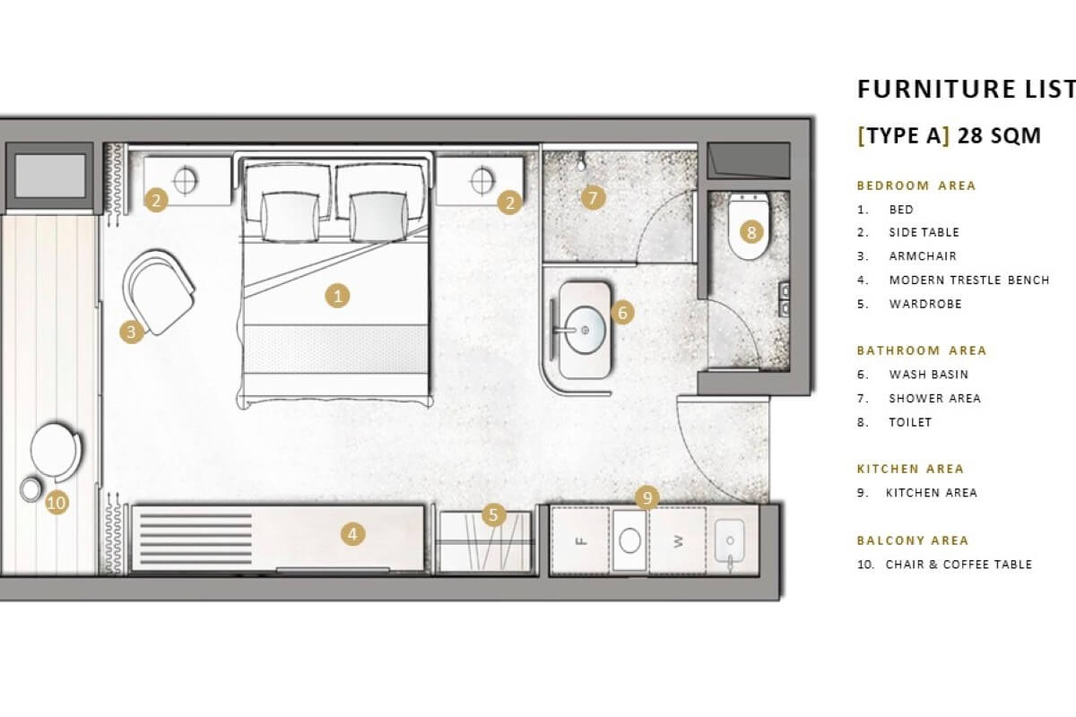 Located on the top floor of the building, the condo enjoys elevated views across the landscaped grounds and artificial river within the development. The unit follows a compact hotel-style layout across a built-up area of 28 sqm. Upon entry, built-in shelving with cabinets and a compact fridge is positioned to the left, with the bathroom located on the right. The main sleeping area is arranged with a king-size bed and TV, leading directly out to a private balcony via sliding doors.
